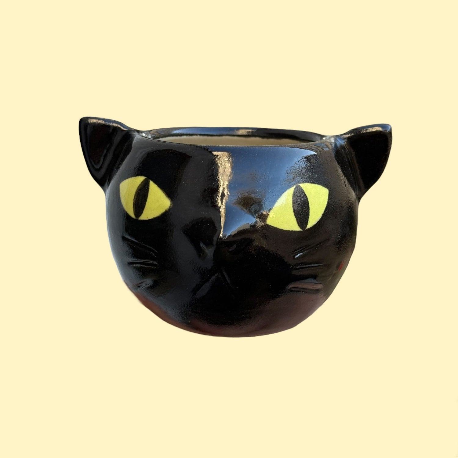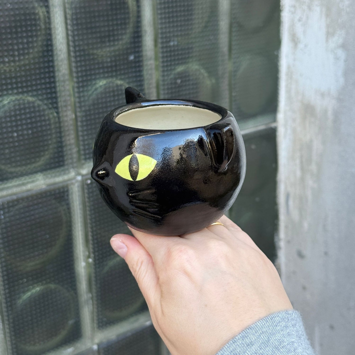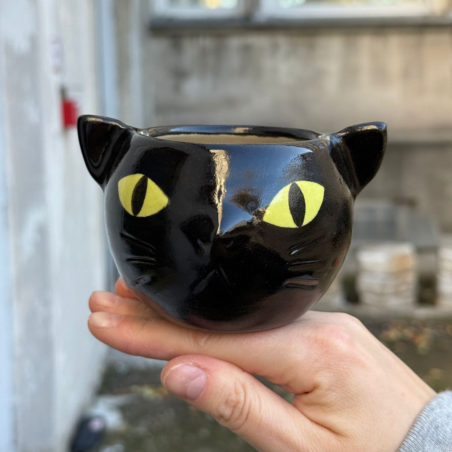 Ręcznie toczona na kole czarka w kształcie głowy kota? nietoperza? kotoperza o jasnozielonych oczach