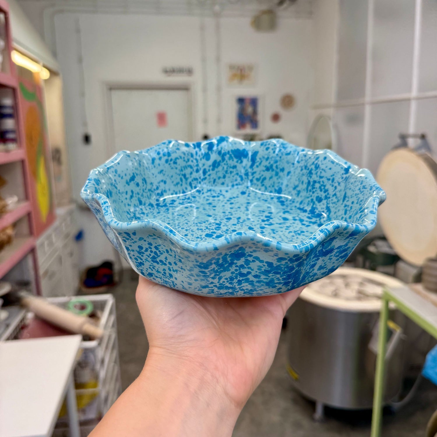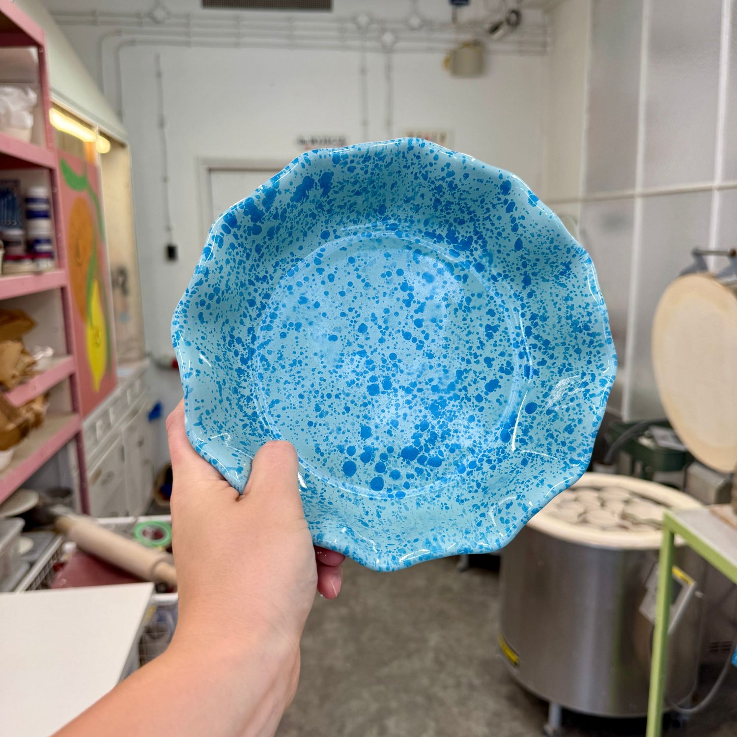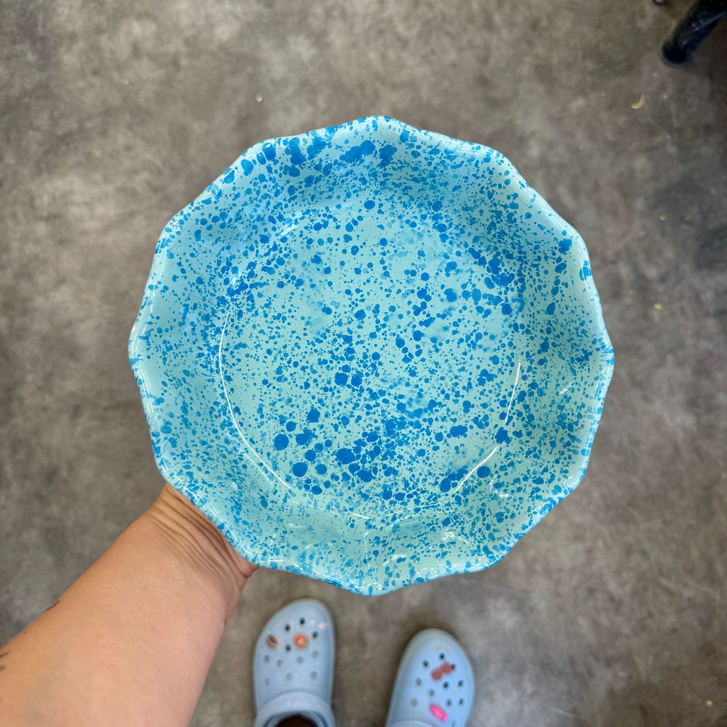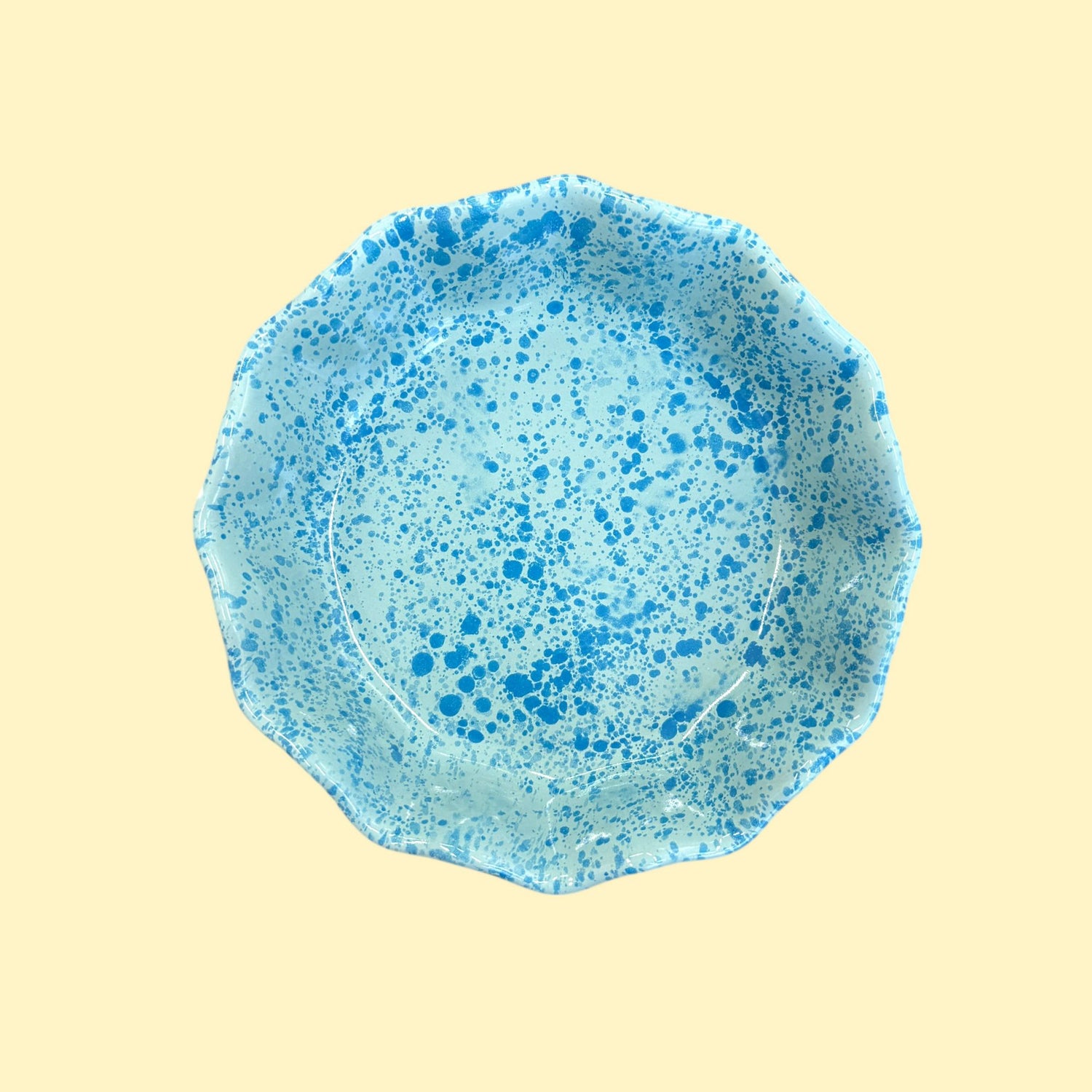Masywny, dość ciężki głęboki talerz, pokryty jasnym miętowym szkliwem z intensywnymi turkusowymi plamkami o różnym natężeniu.