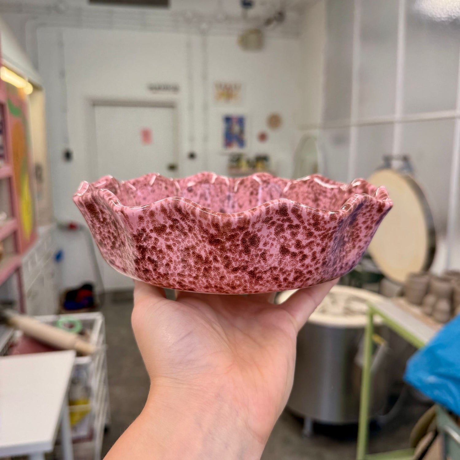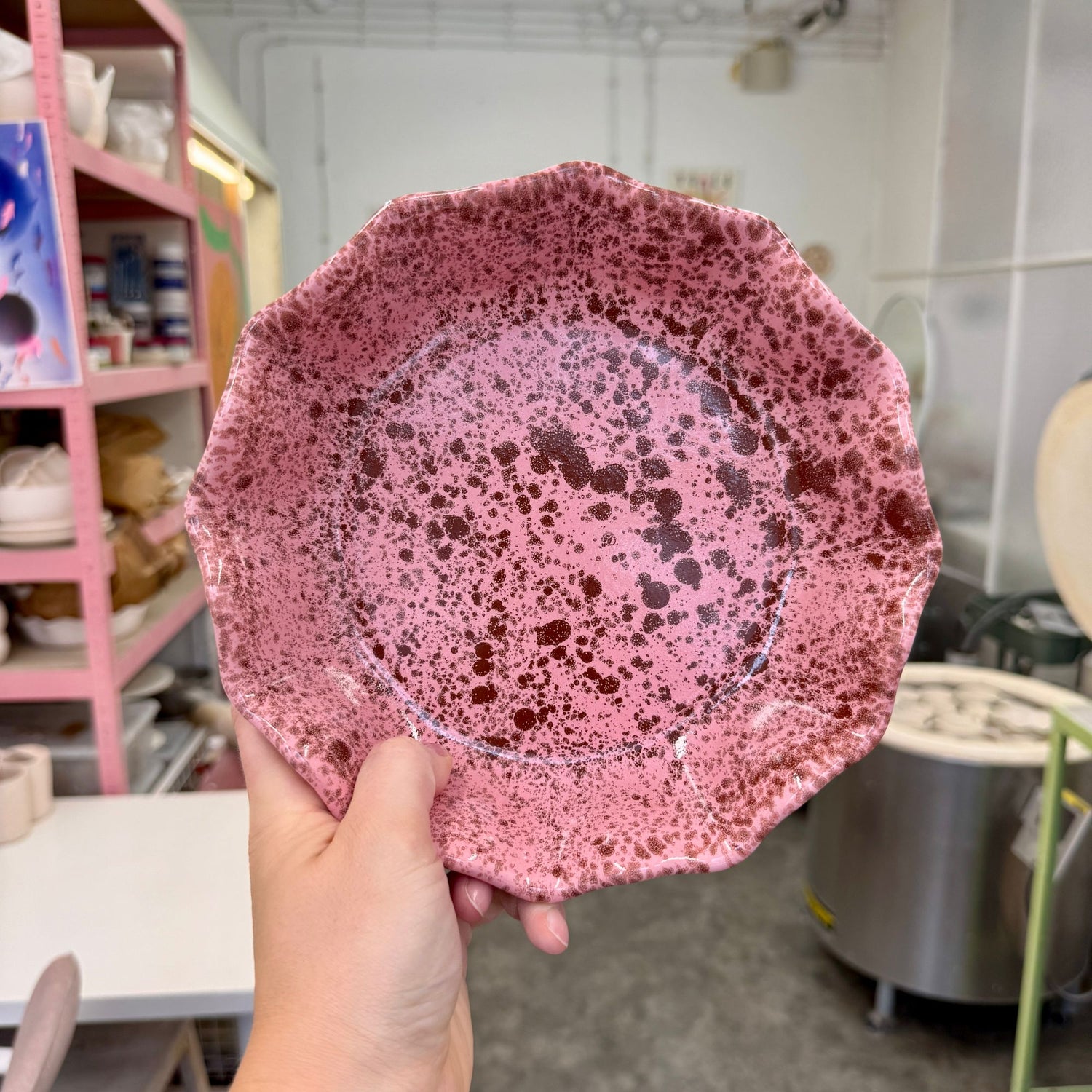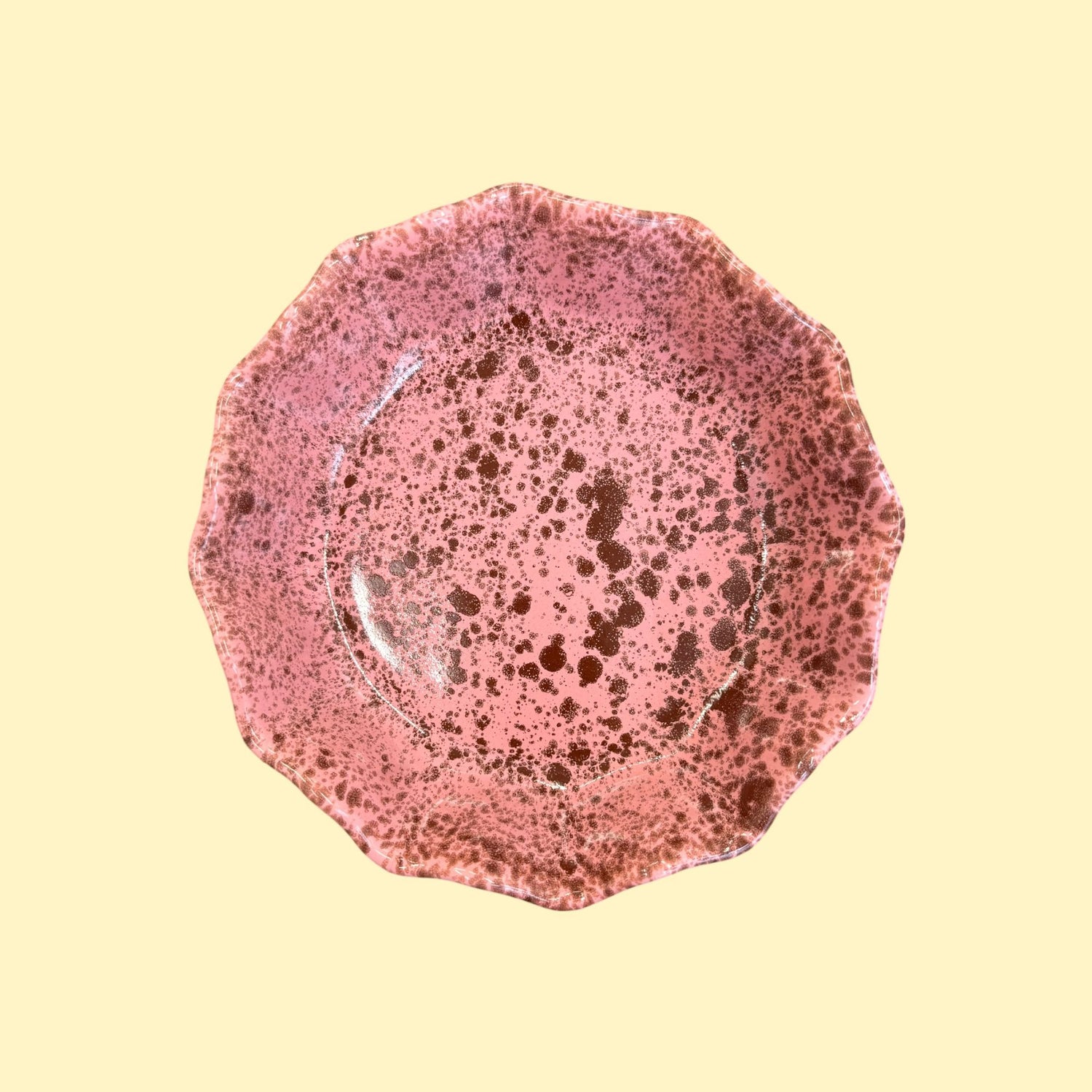 Masywny, dość ciężki głęboki talerz, pokryty jasnym różowym szkliwem z brązowymi plamkami o różnym natężeniu.