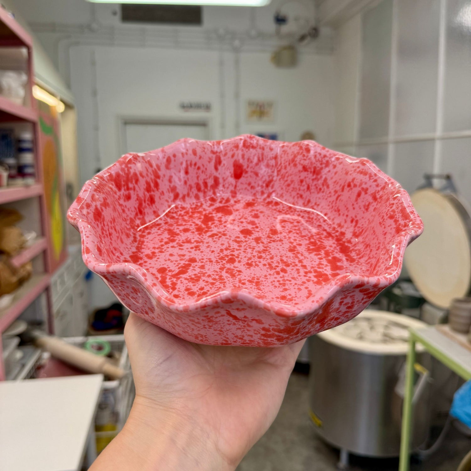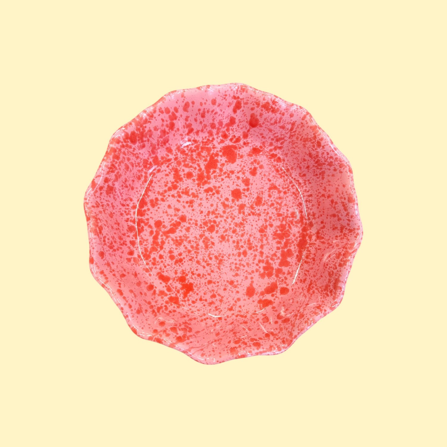 Masywny, dość ciężki głęboki talerz, pokryty jasnym różowym szkliwem z czerwonymi plamkami o różnym natężeniu.