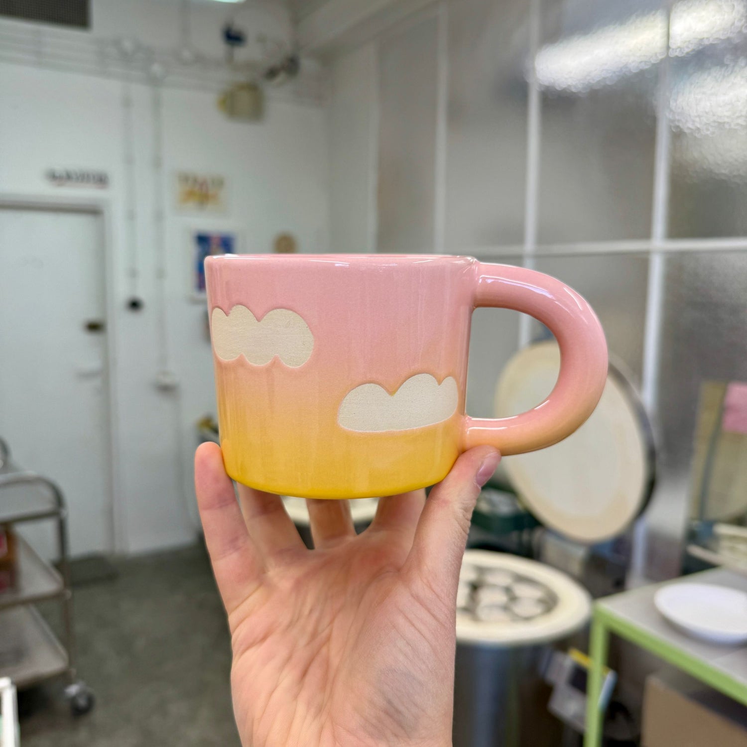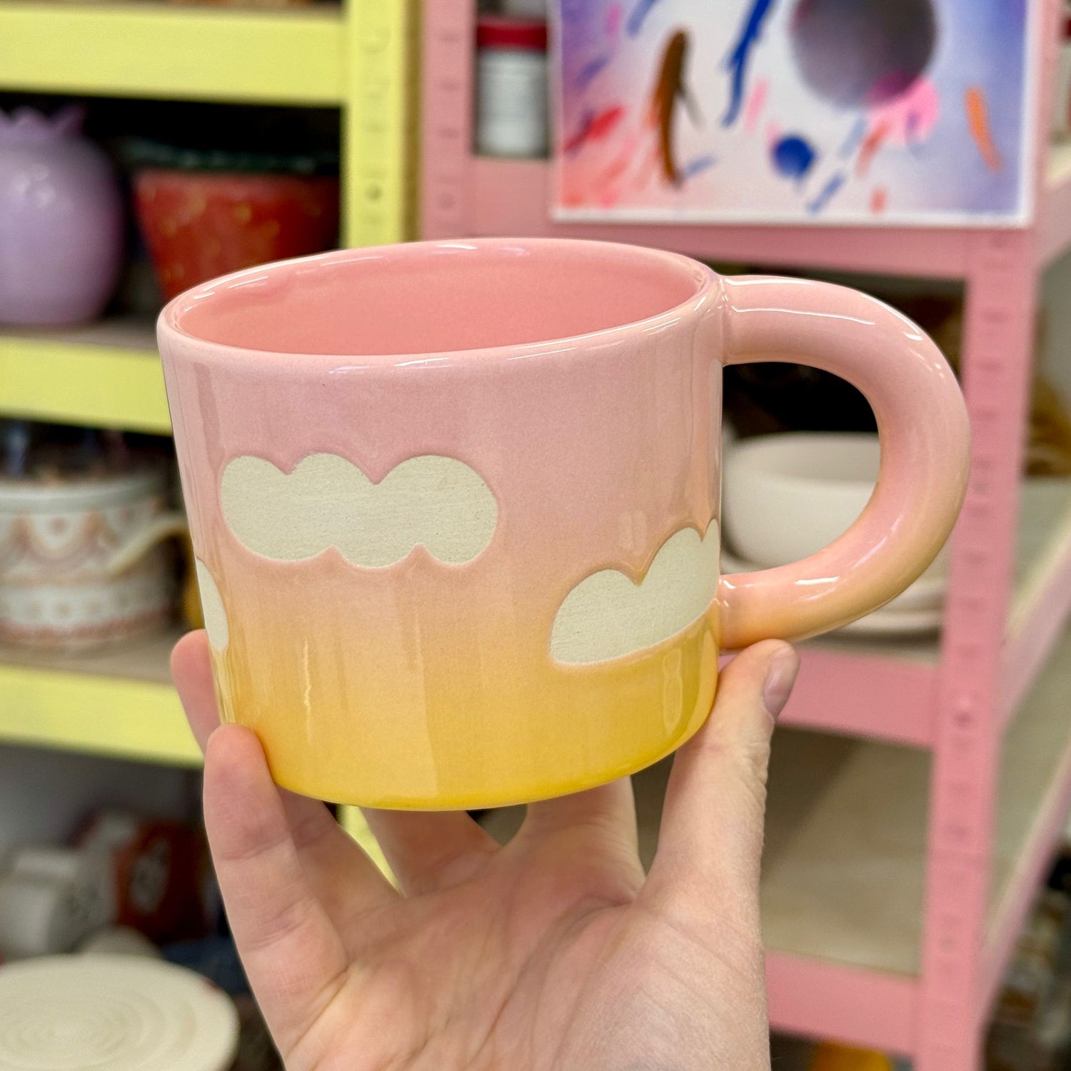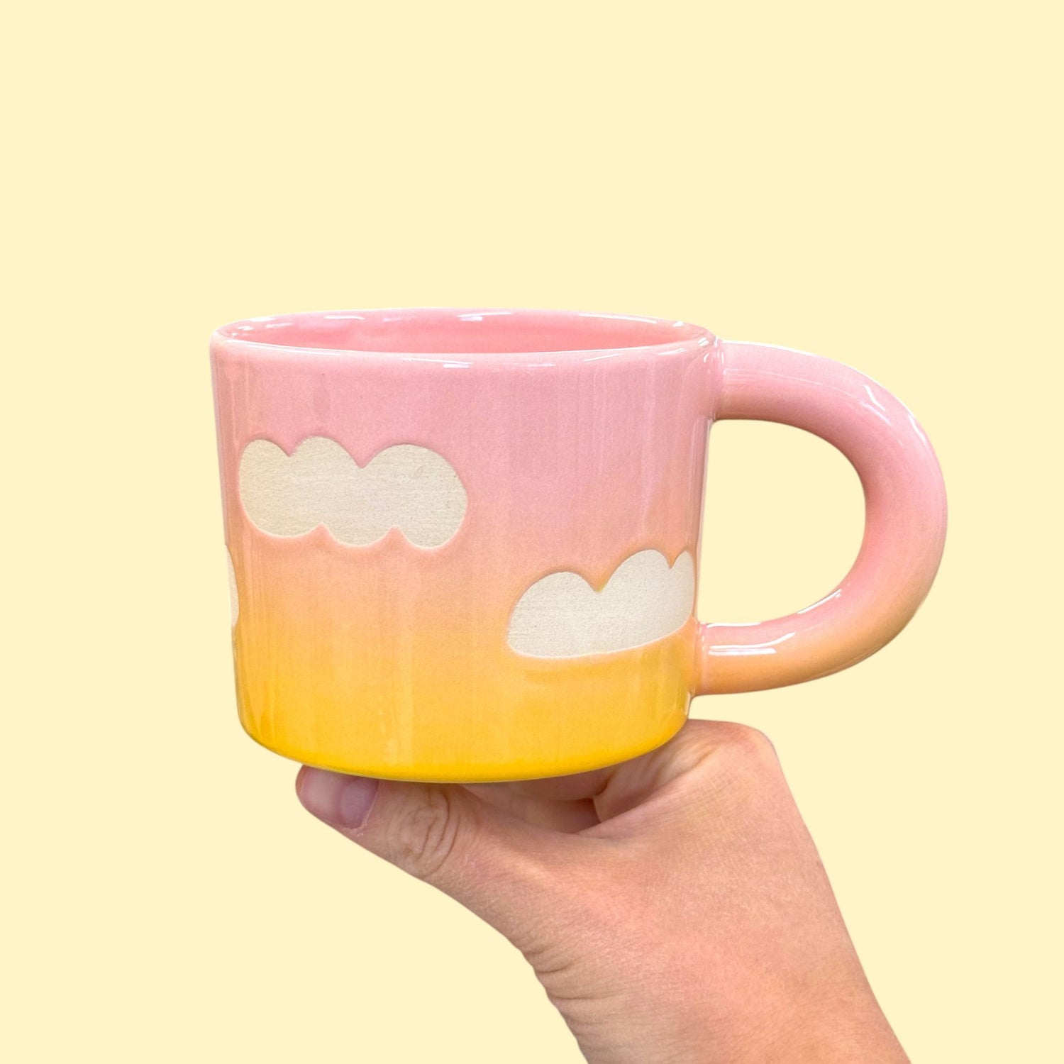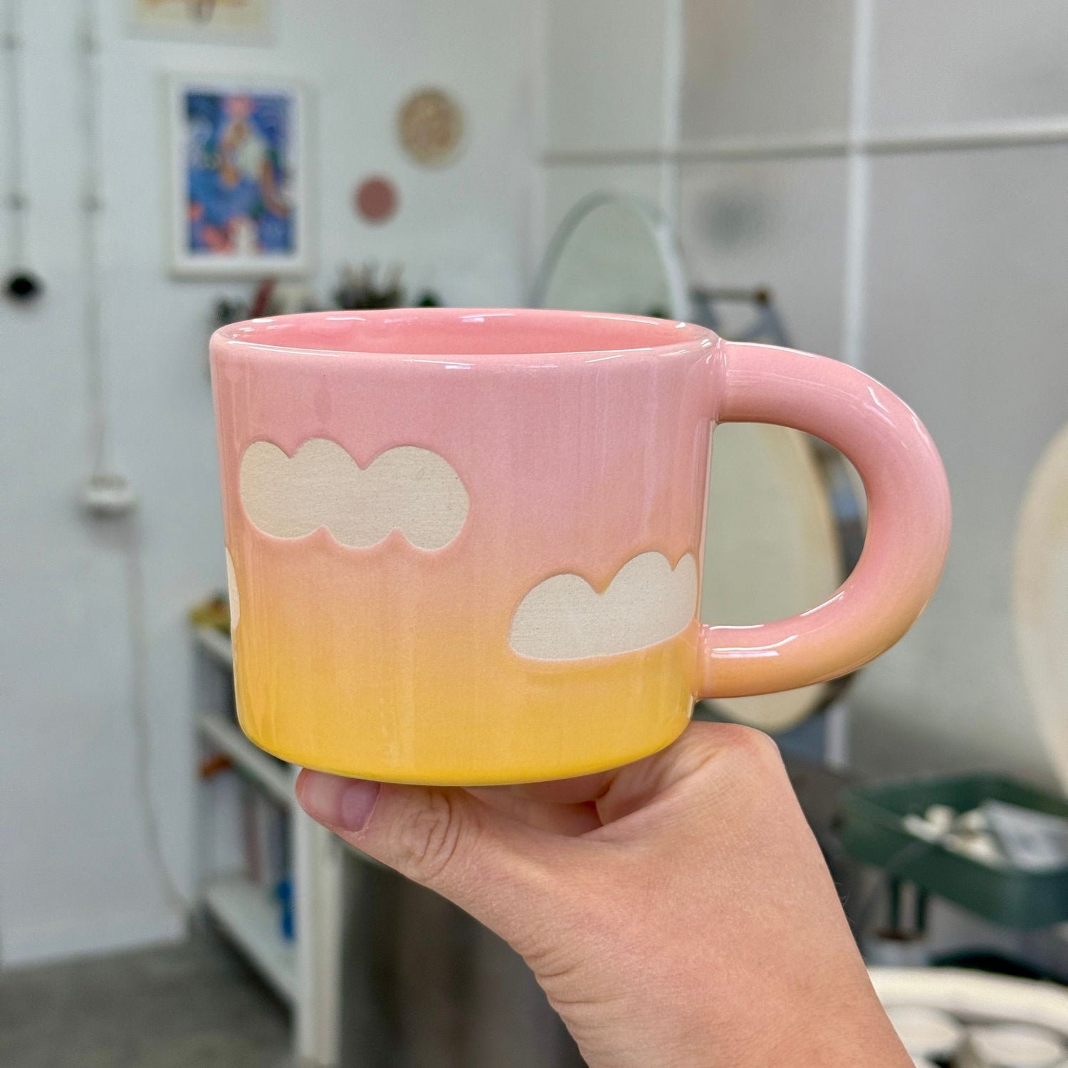 Ręcznie wykonany i malowany kubek z niebiańskim wzorem. Każdy kubek ma inaczej rozmieszczone chmurki. Pokryty jest błyszczącym różowym szkliwem, a chmury są nie poszkliwione, i delikatnie matowe.