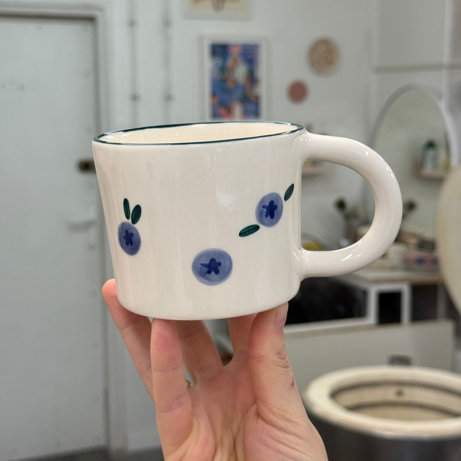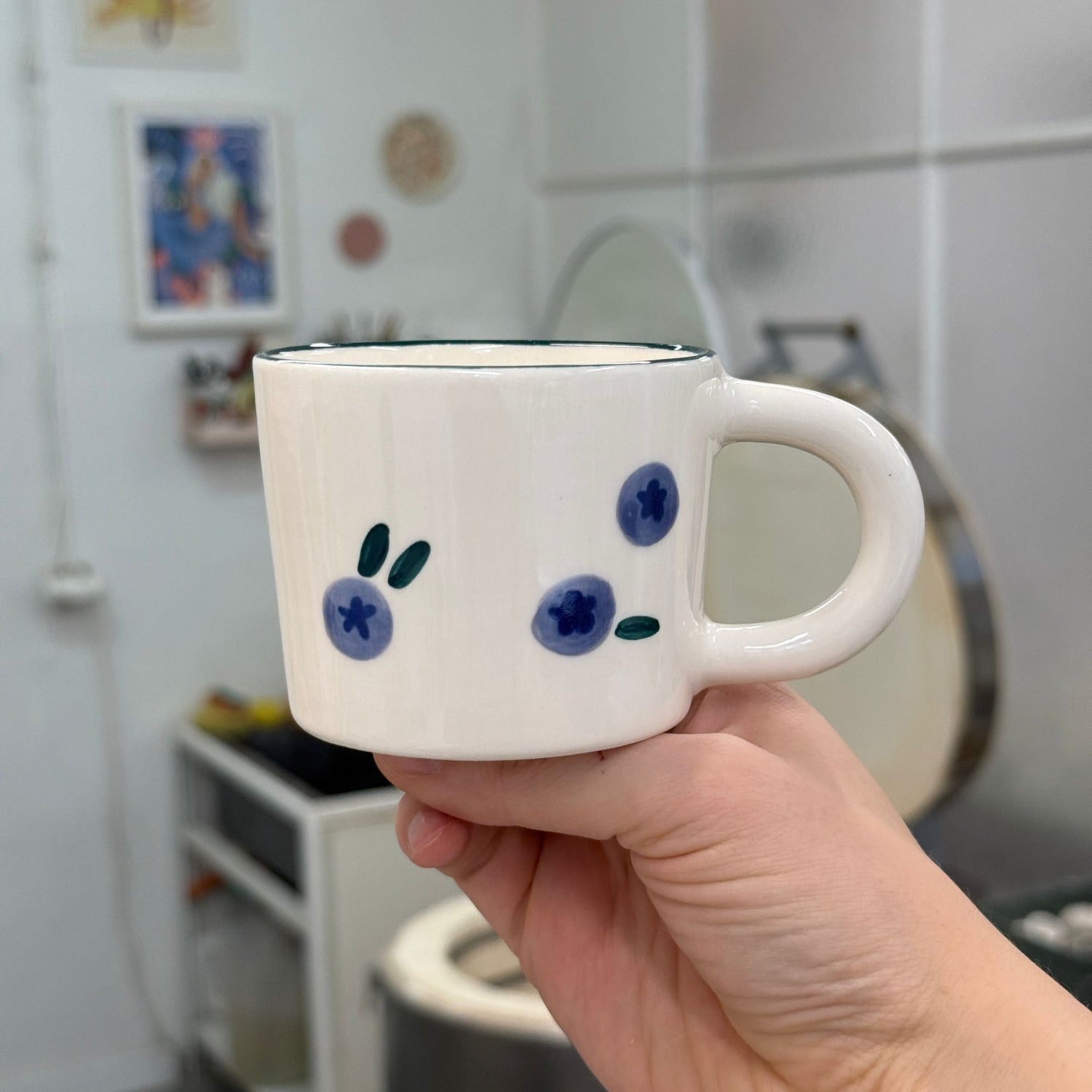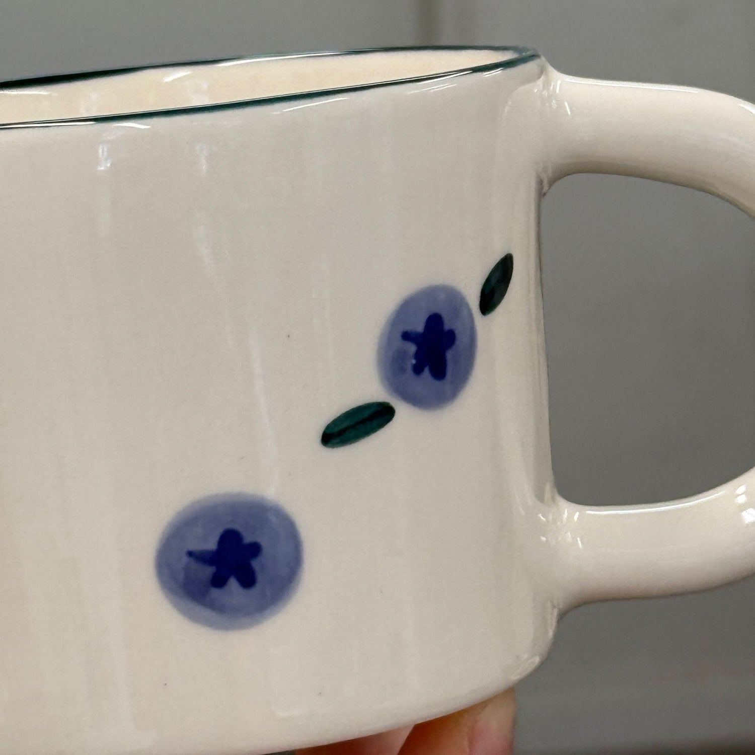 Ręcznie wykonany i malowany kubek z motywem leśnych owoców i rustykalnym, ciemnozielonym rantem.