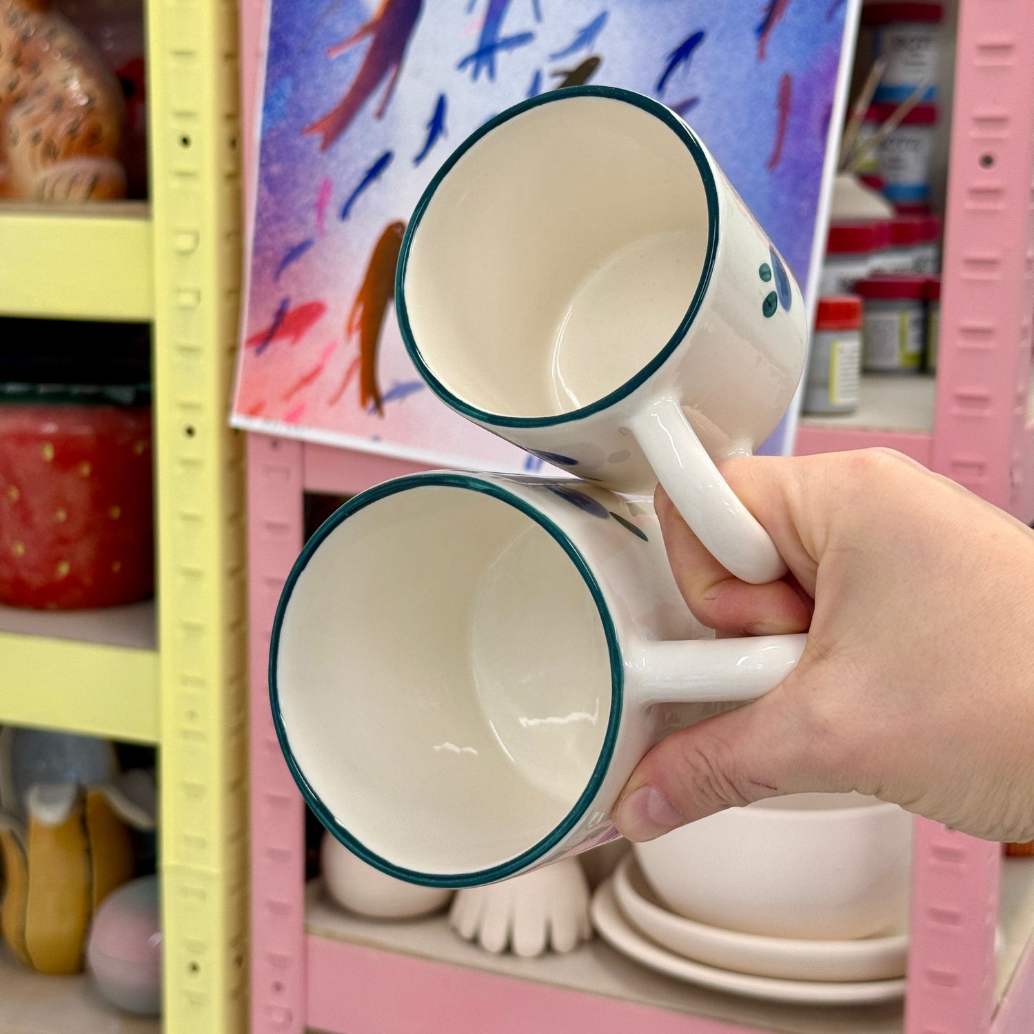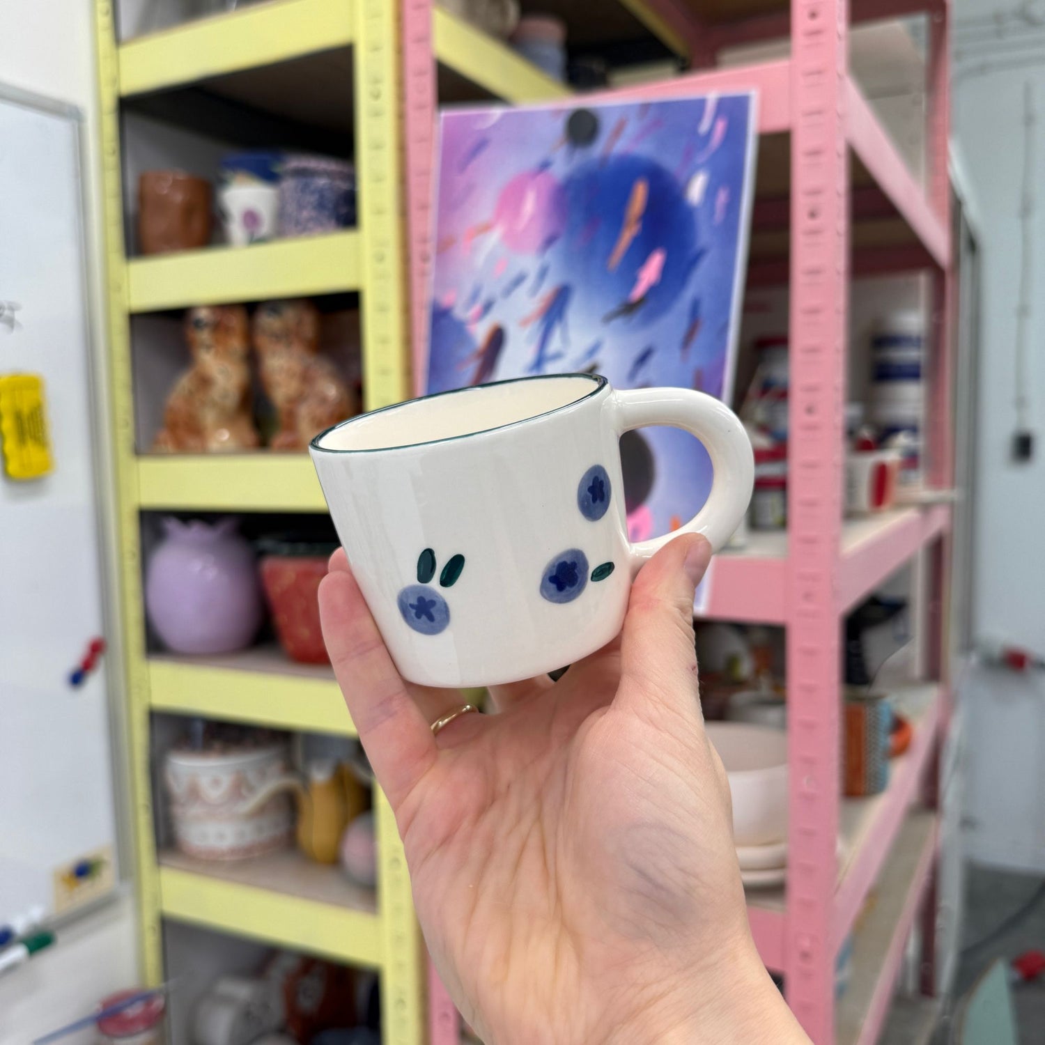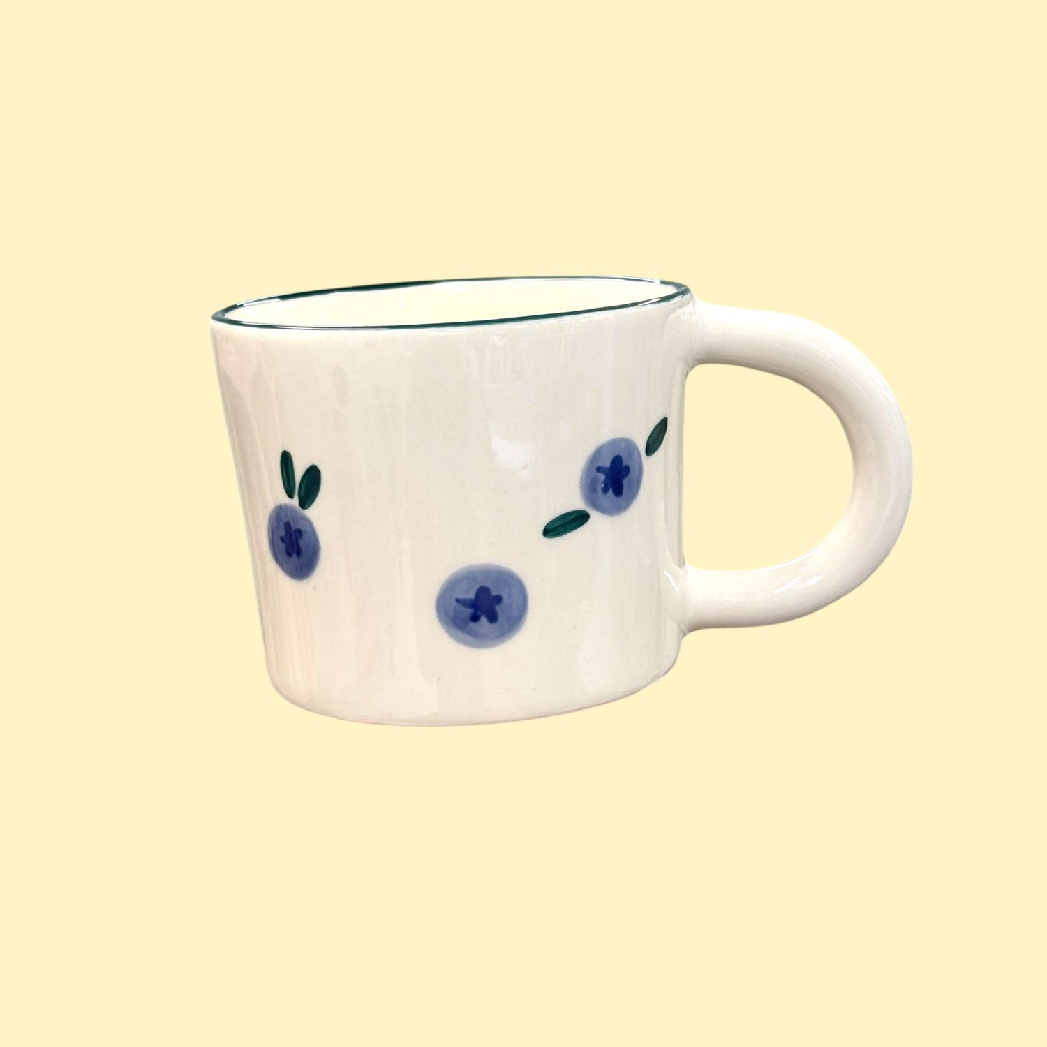 Ręcznie wykonany i malowany kubek z motywem leśnych owoców i rustykalnym, ciemnozielonym rantem.