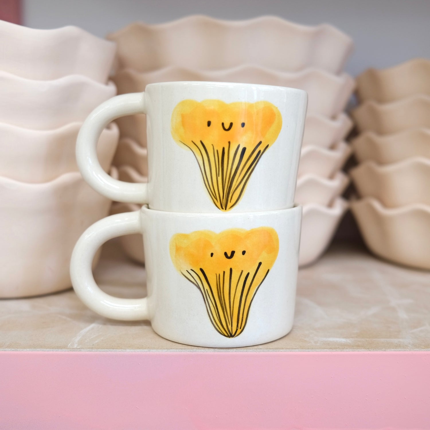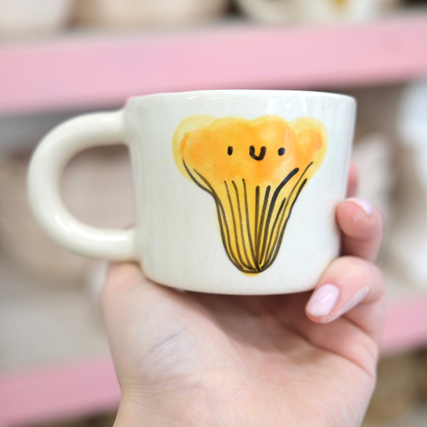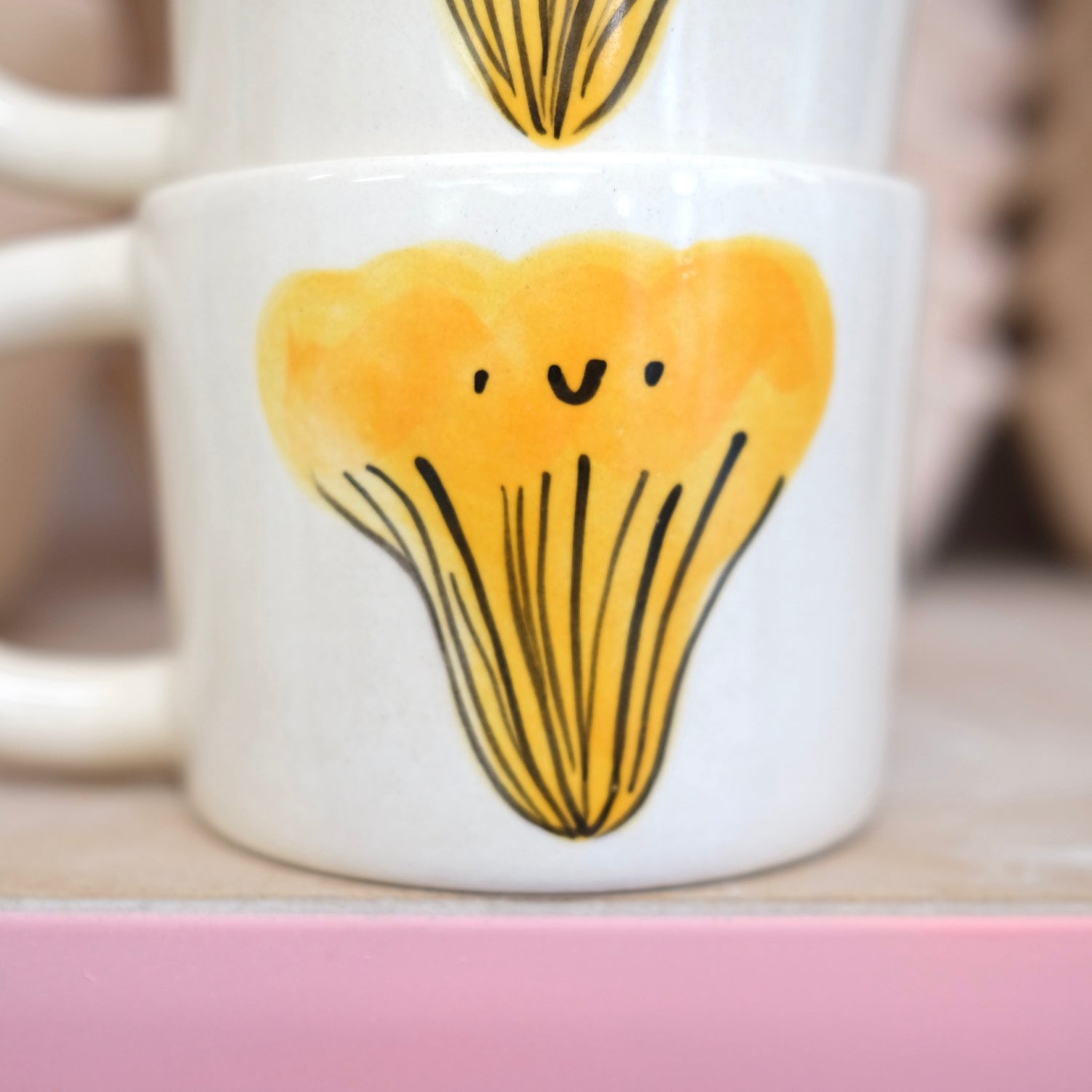 Ręcznie wykonany i malowany kubek z parą uśmiechniętych żółtych grzybków.