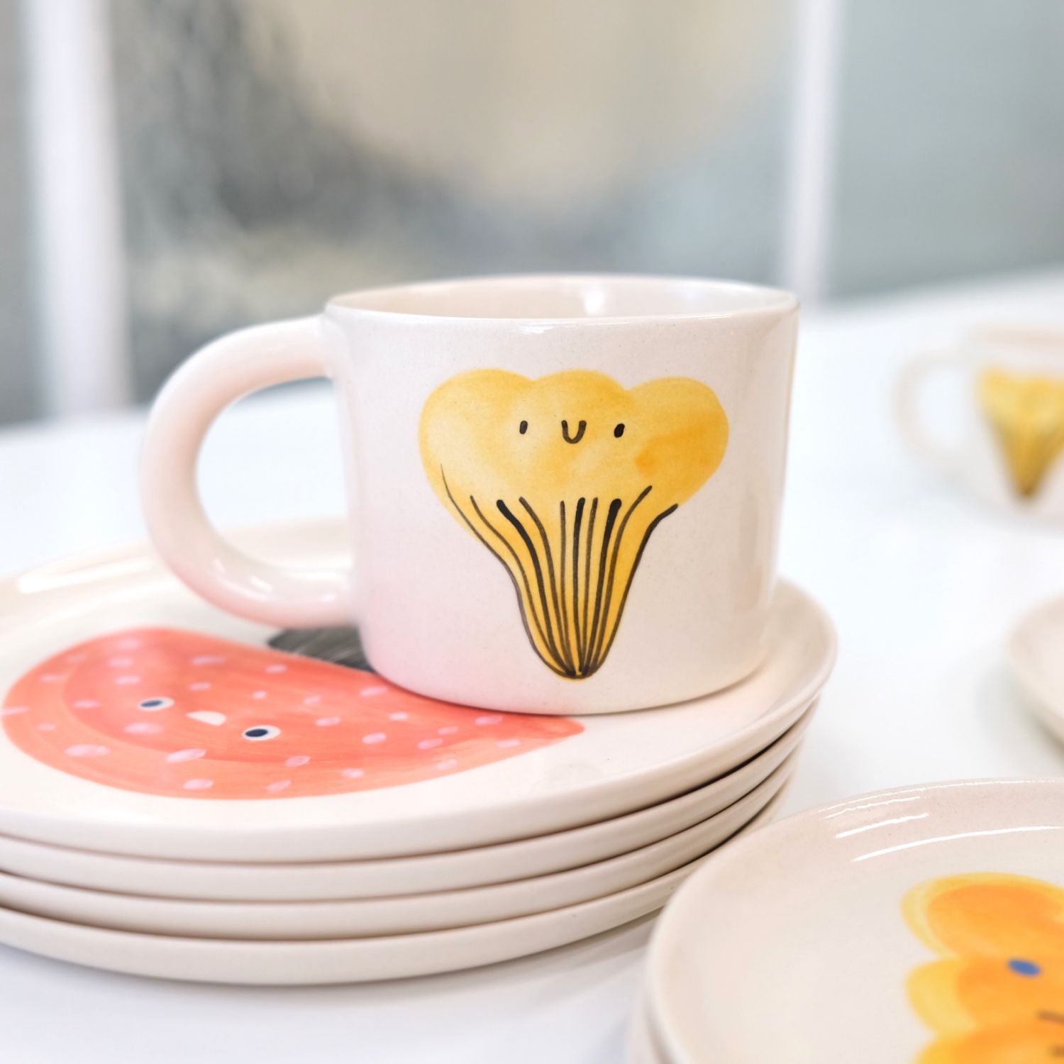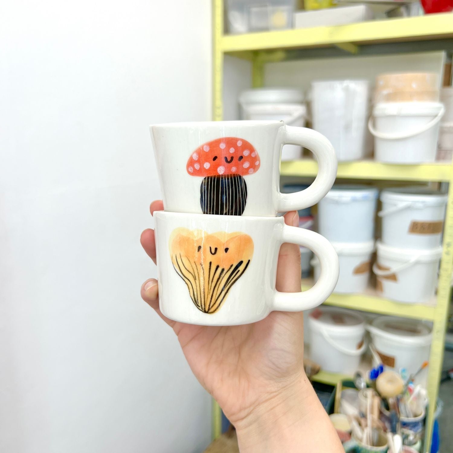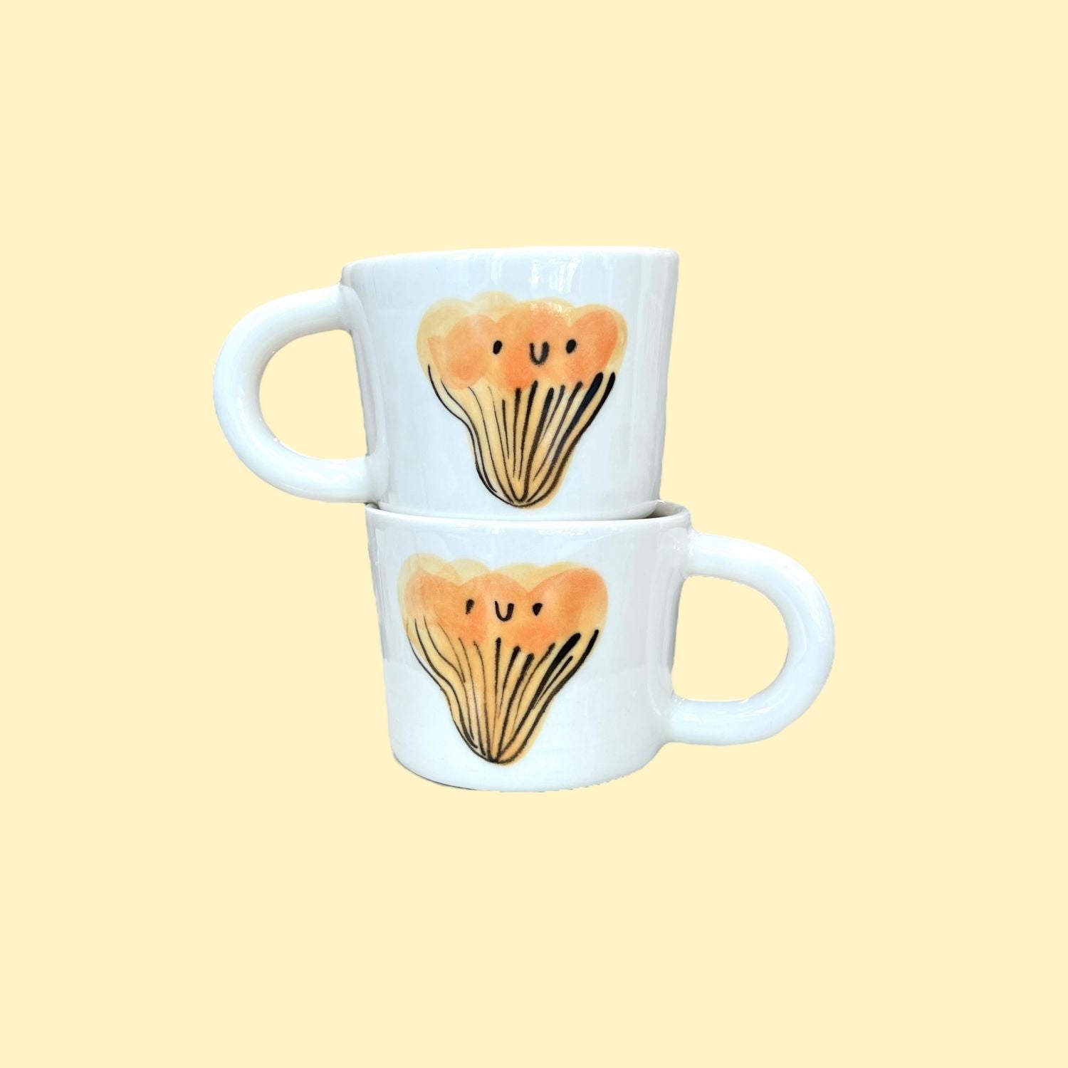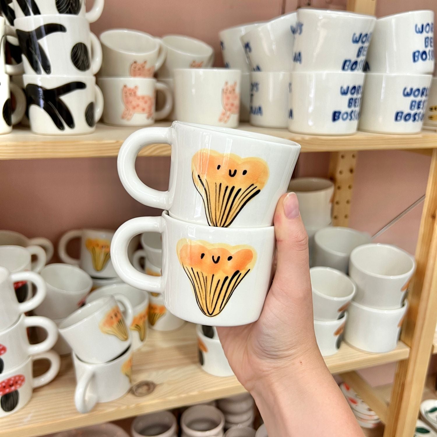 Ręcznie wykonany i malowany kubek z parą uśmiechniętych żółtych grzybków.