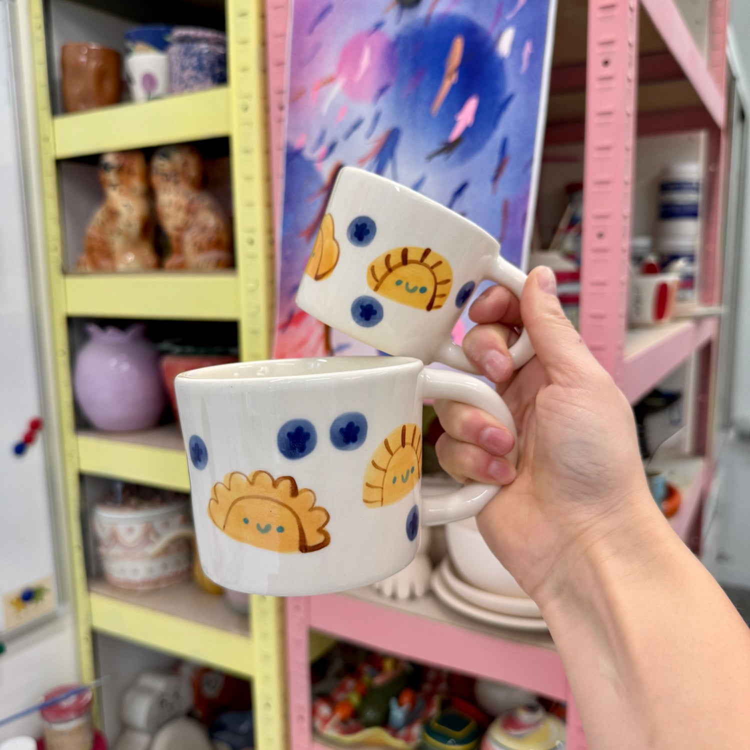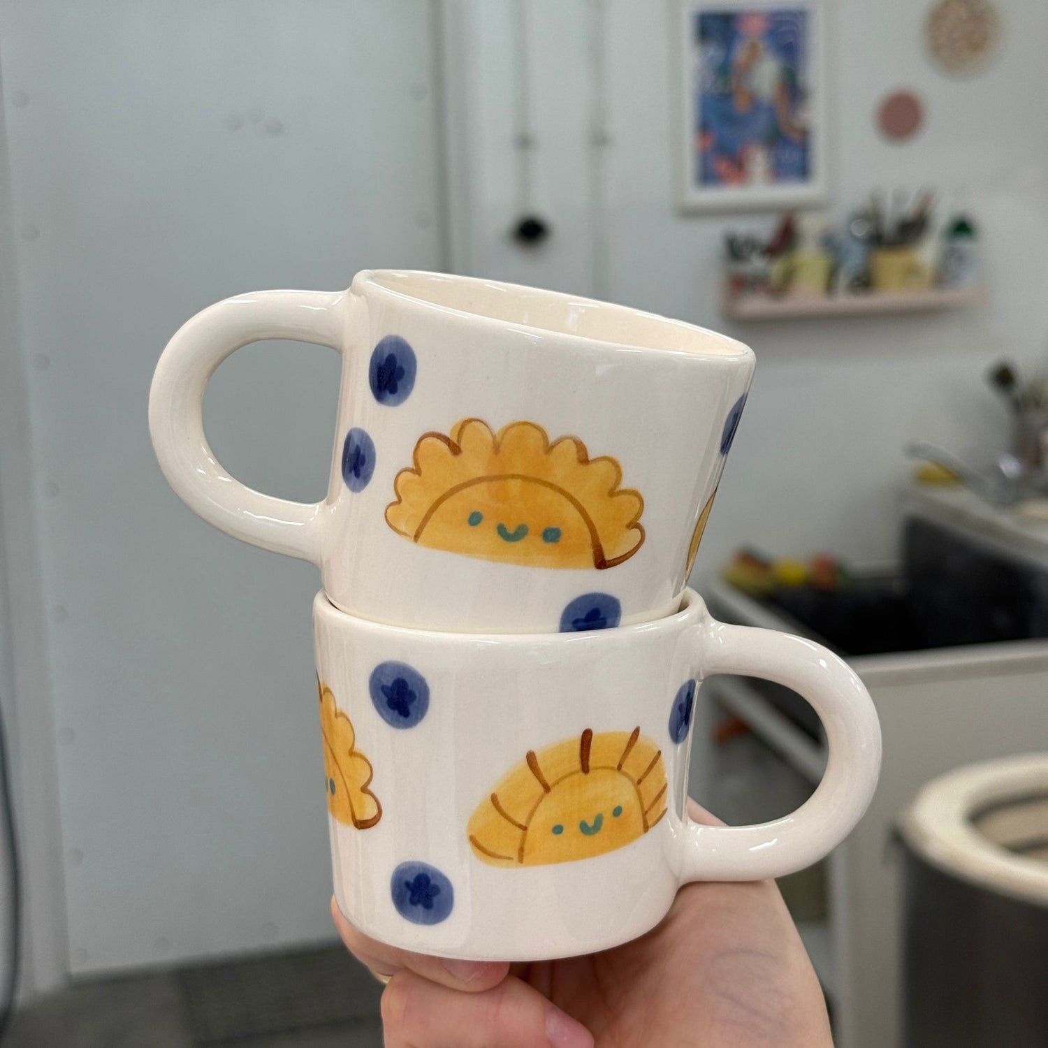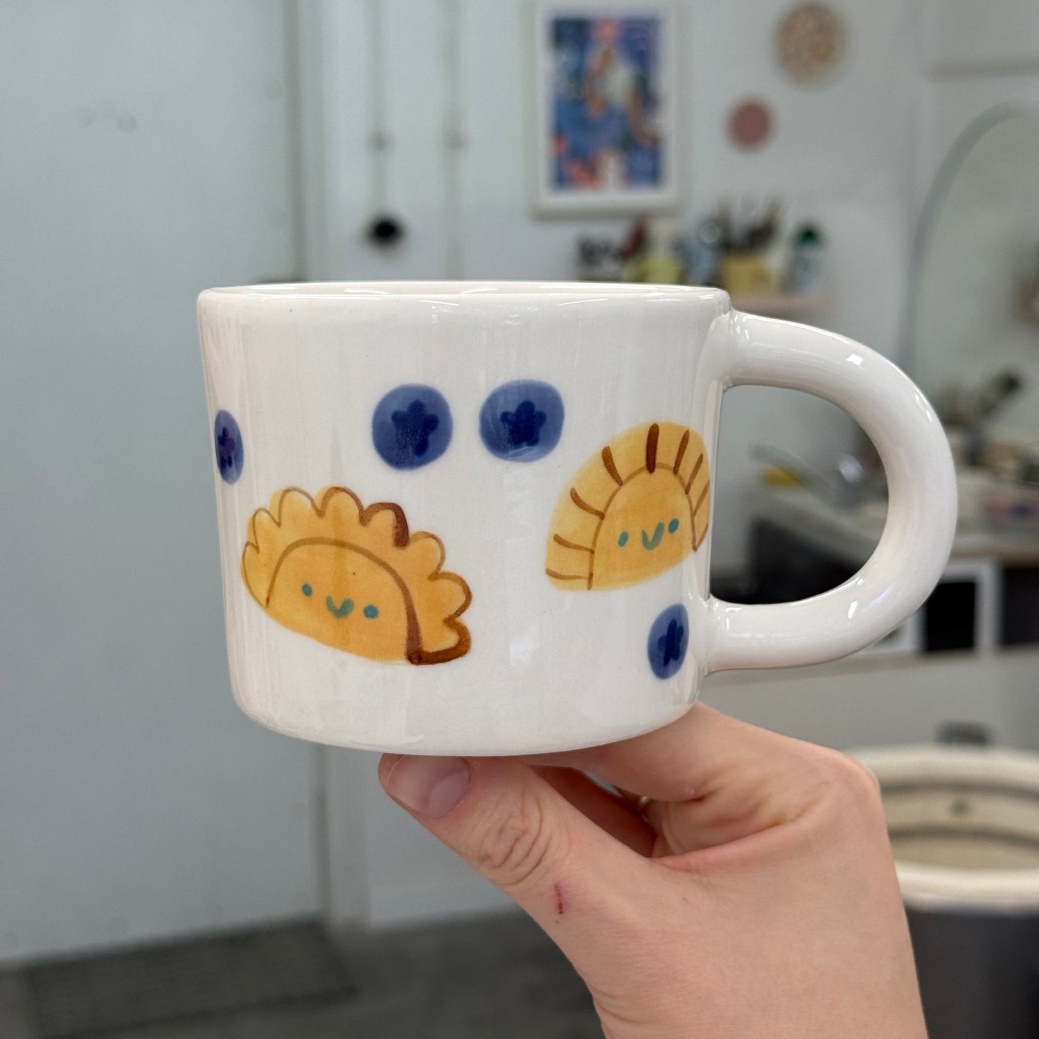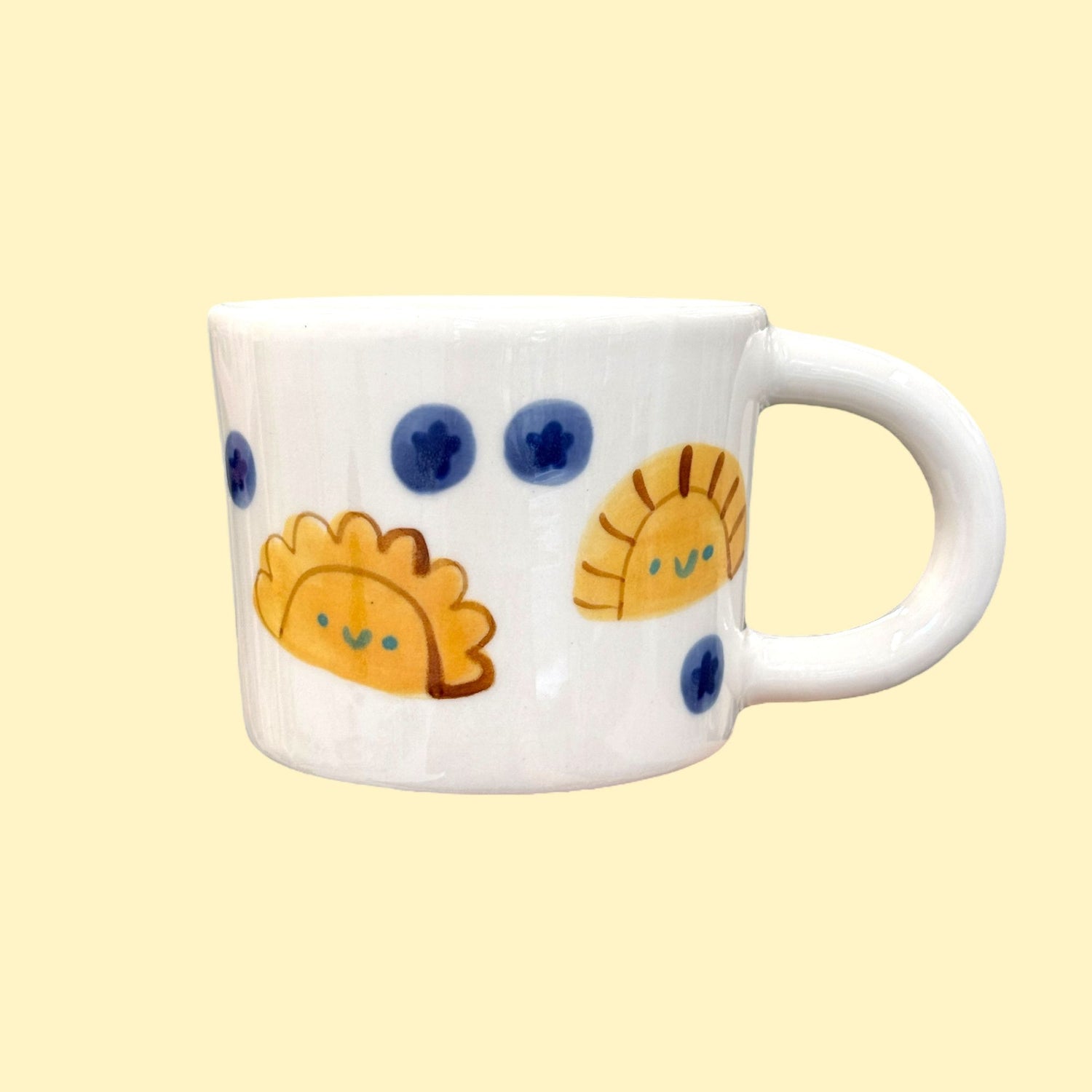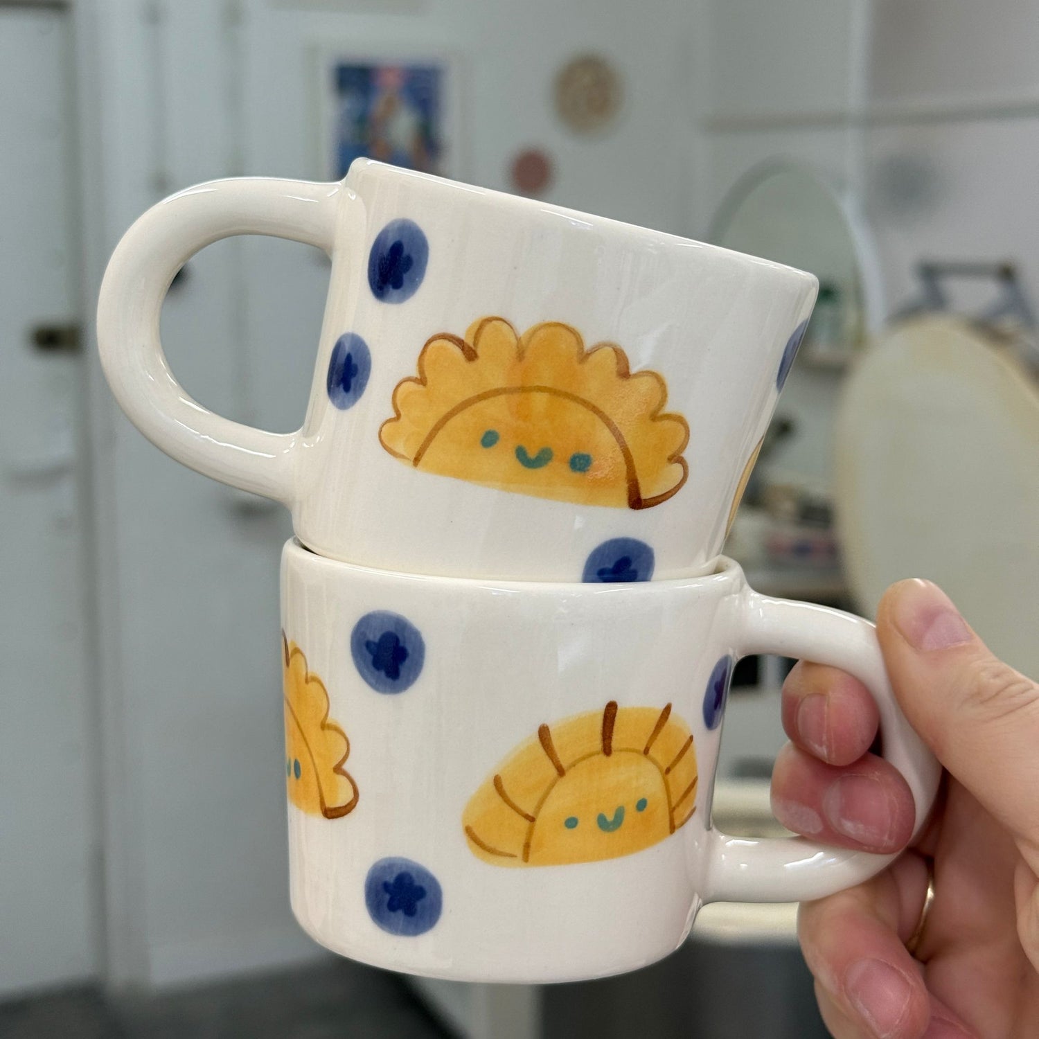 Sezonowy przebój Trzasku, czyli ręcznie wykonany i malowany kubek z uśmiechniętymi pierożkami i jagódkami (lub borówkami - jak kto uważa :)