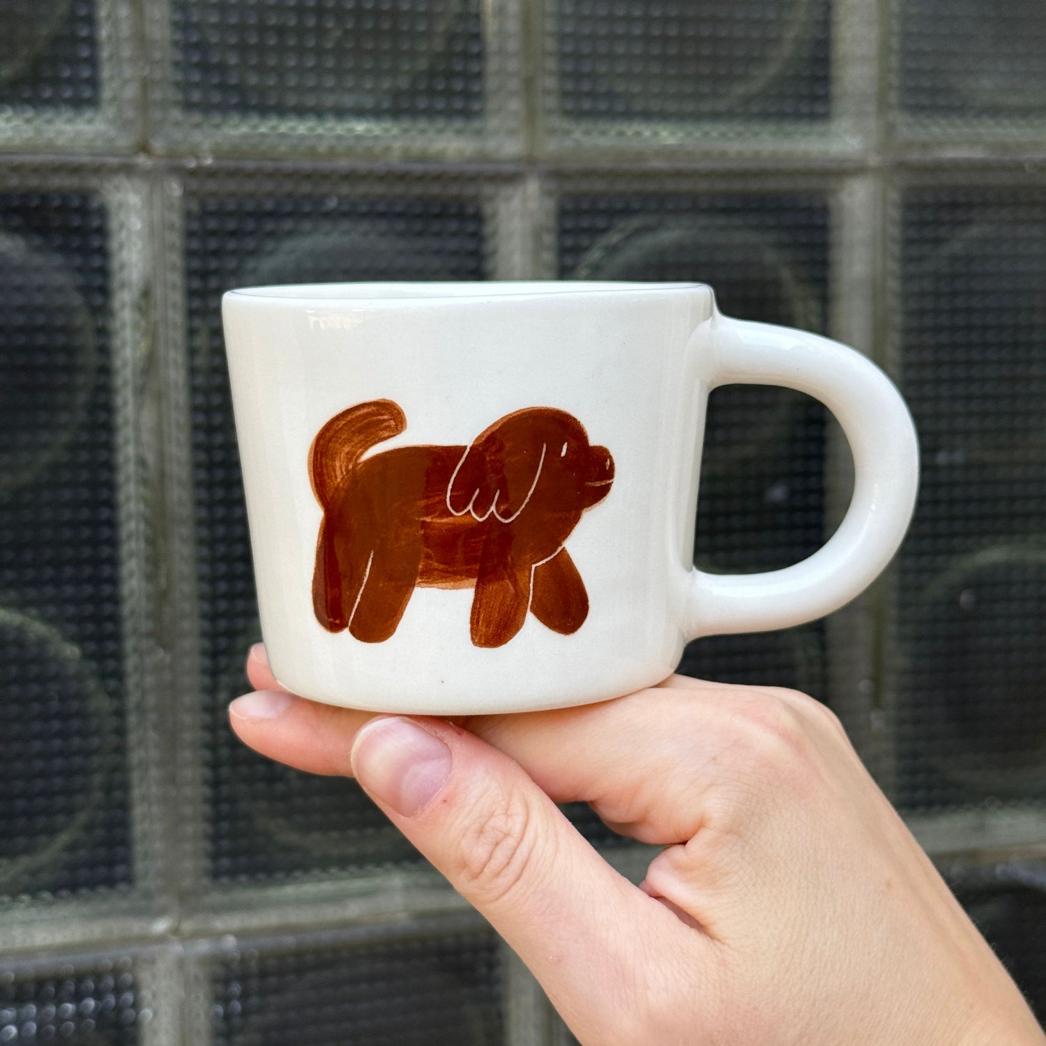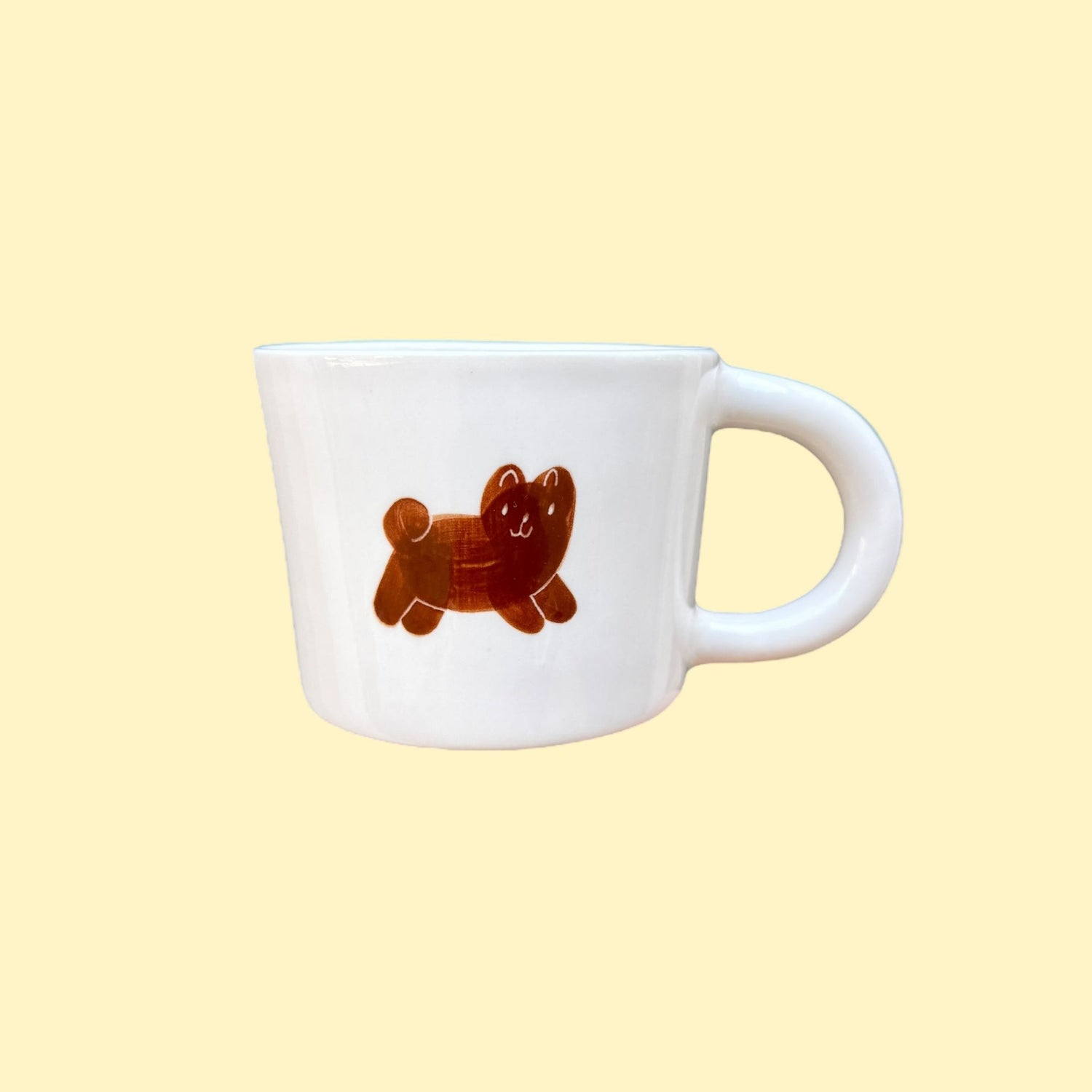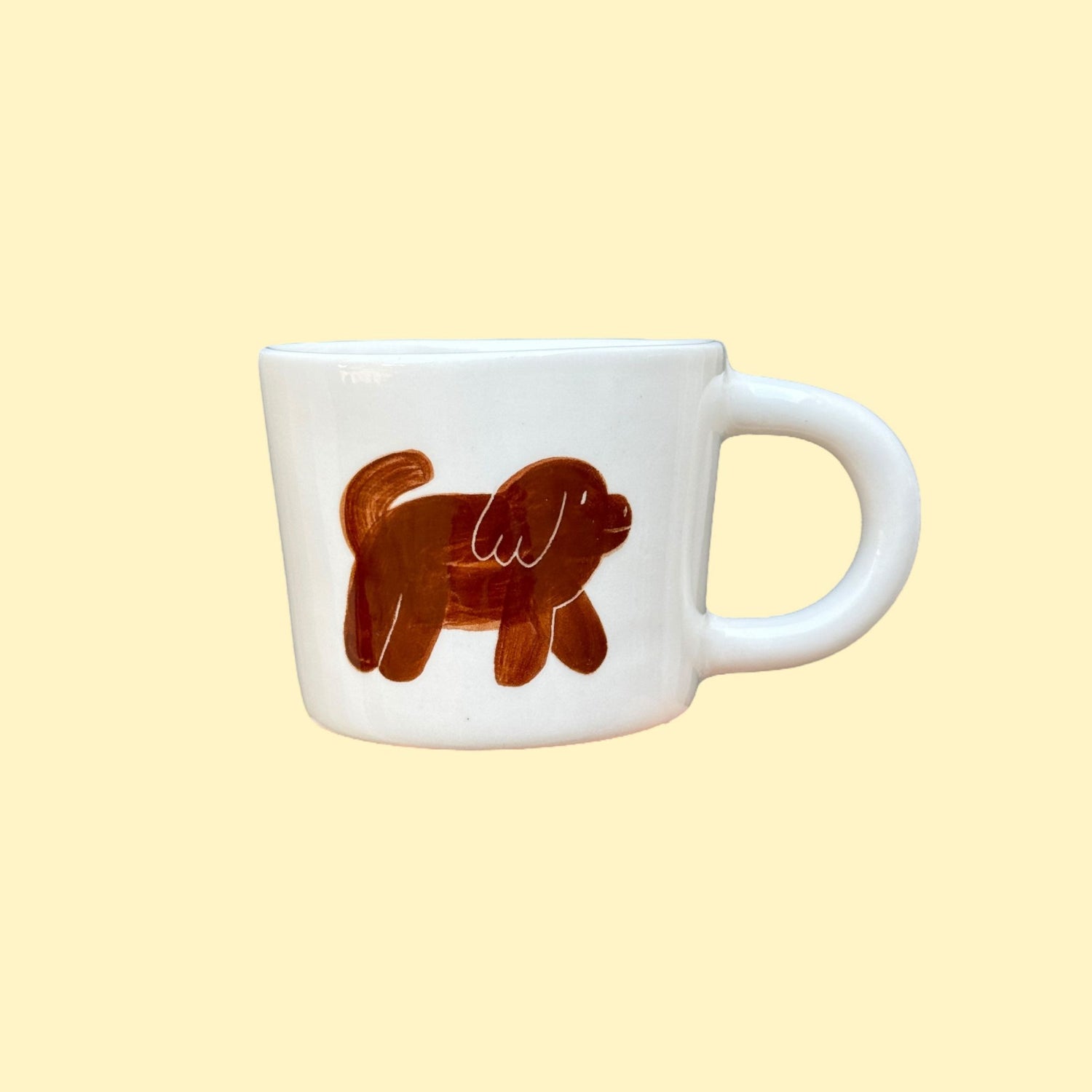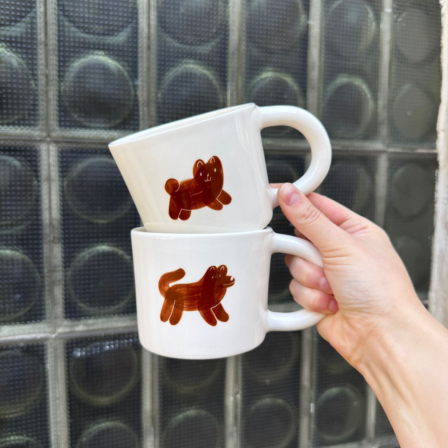Ręcznie wykonany i malowany kubek z parą brązowych piesków w różnych wzorach.