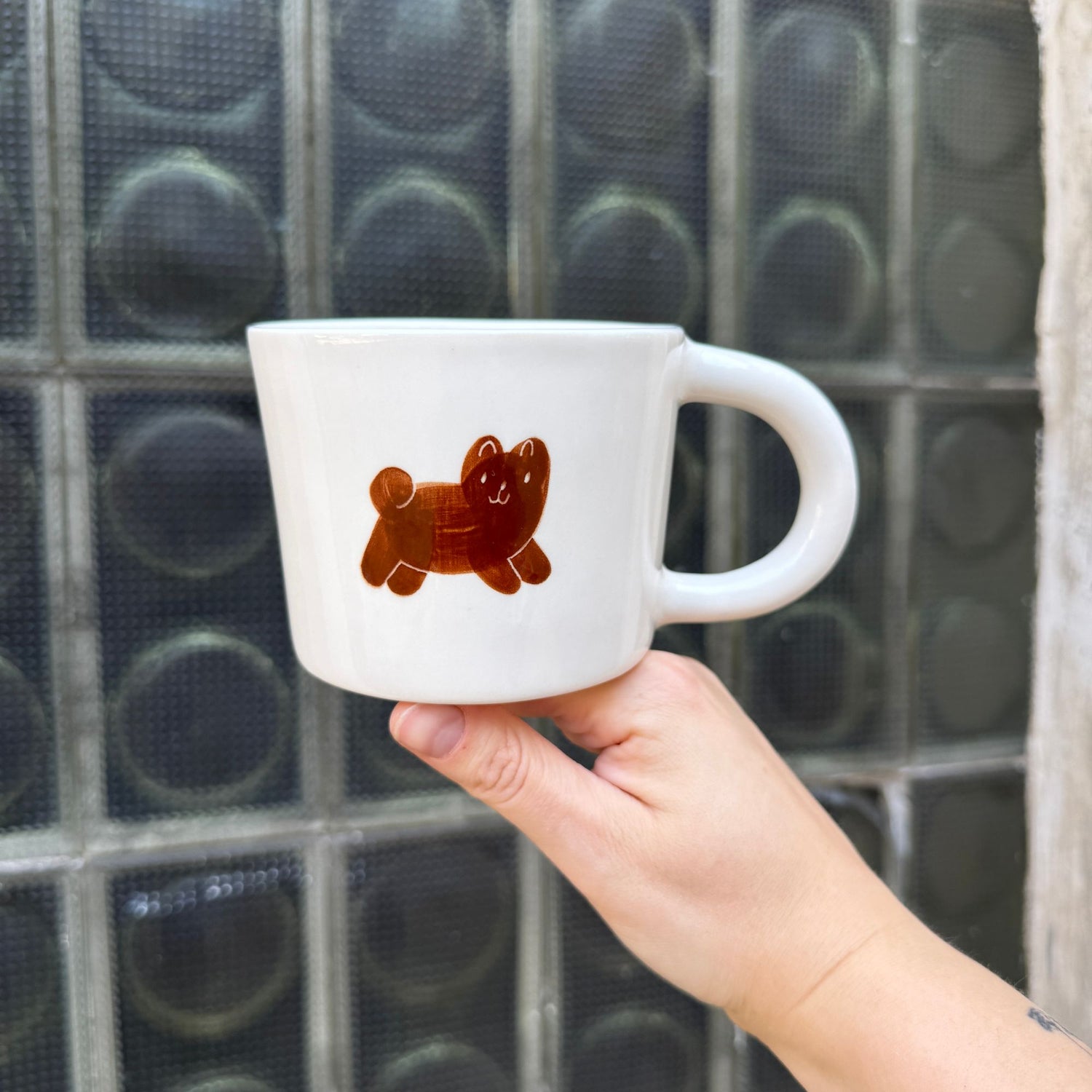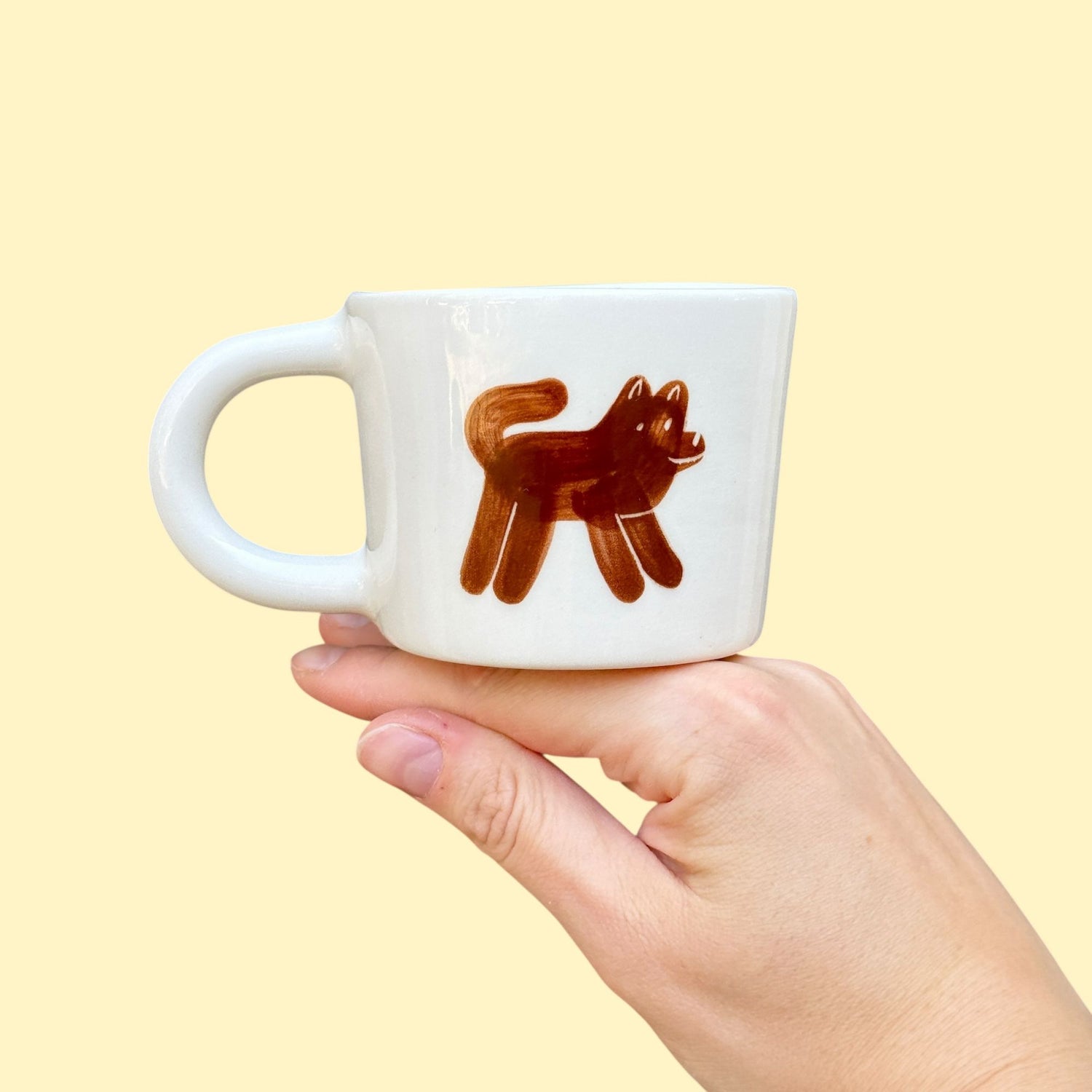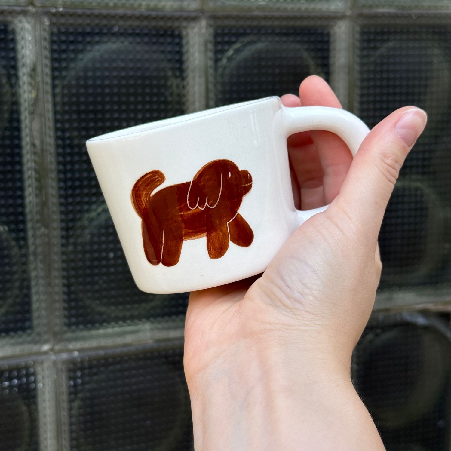 Ręcznie wykonany i malowany kubek z parą brązowych piesków w różnych wzorach.