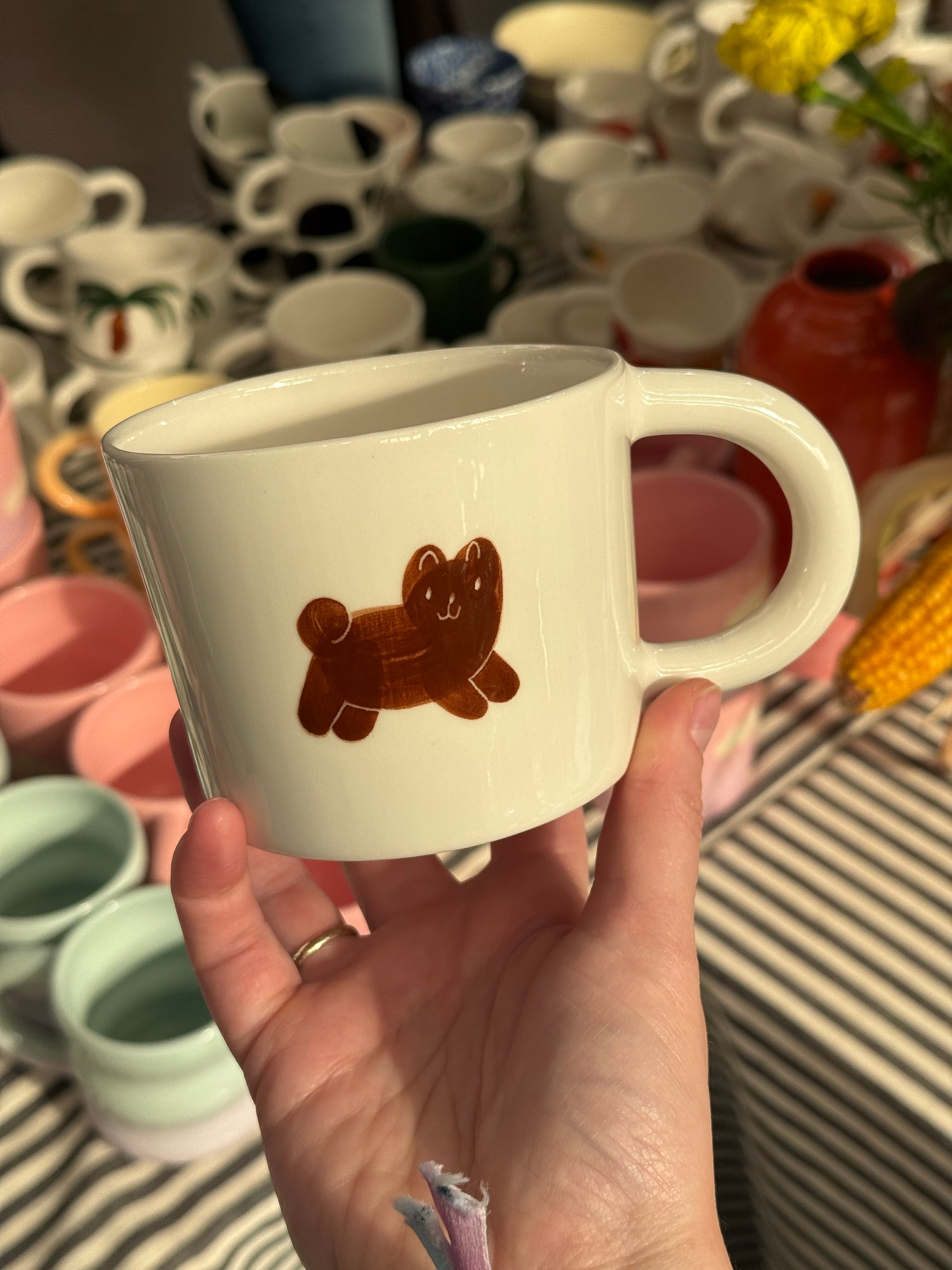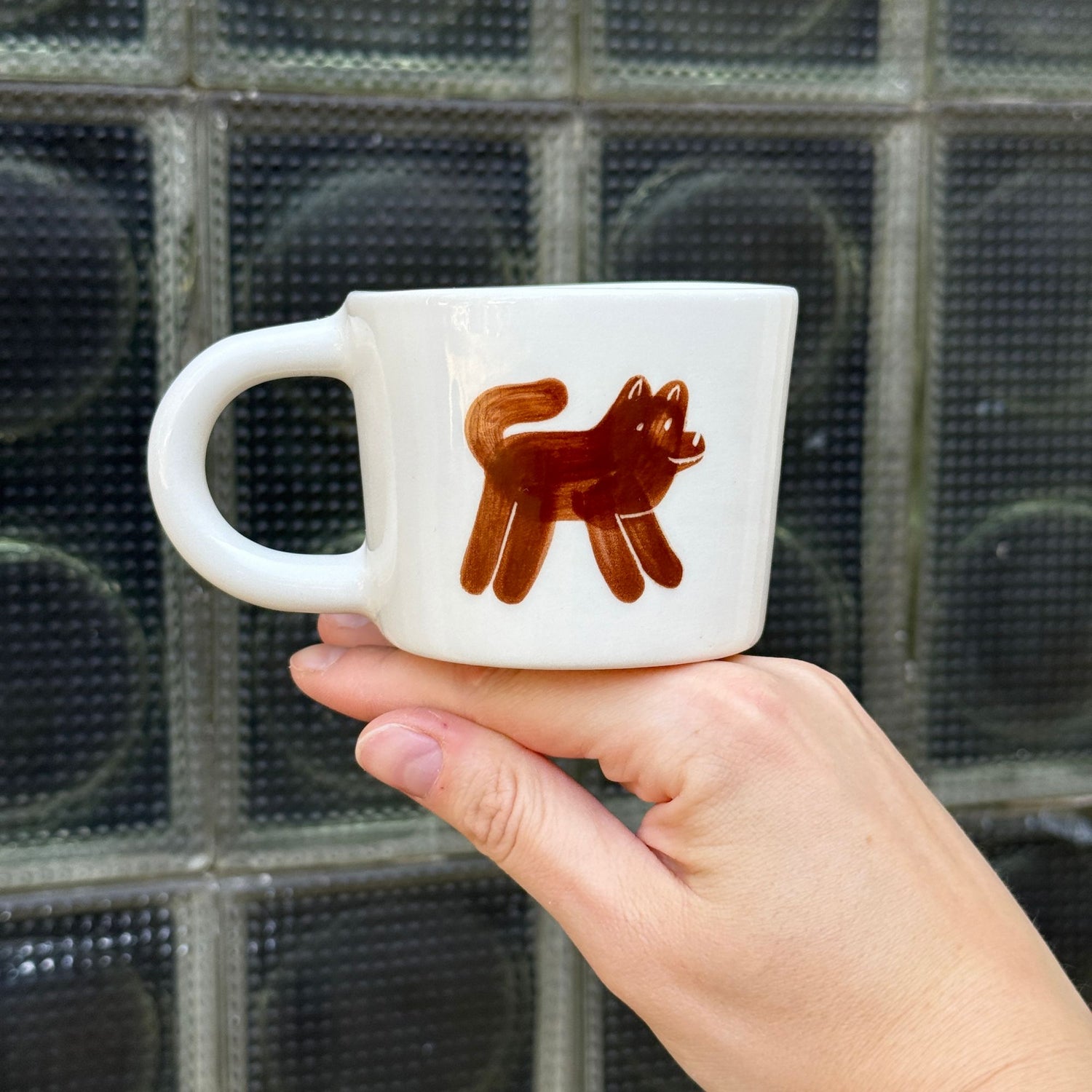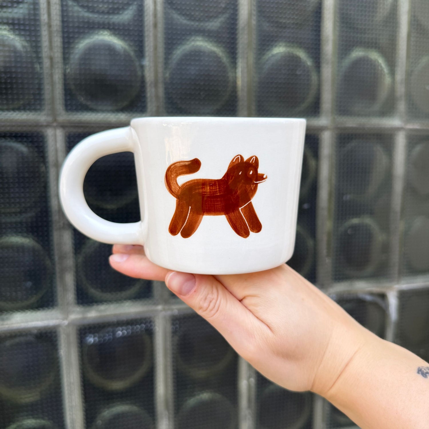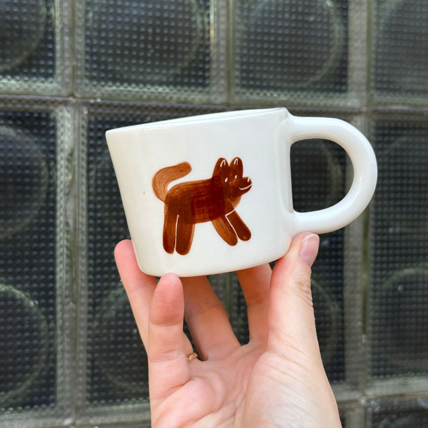 Ręcznie wykonany i malowany kubek z parą brązowych piesków w różnych wzorach.