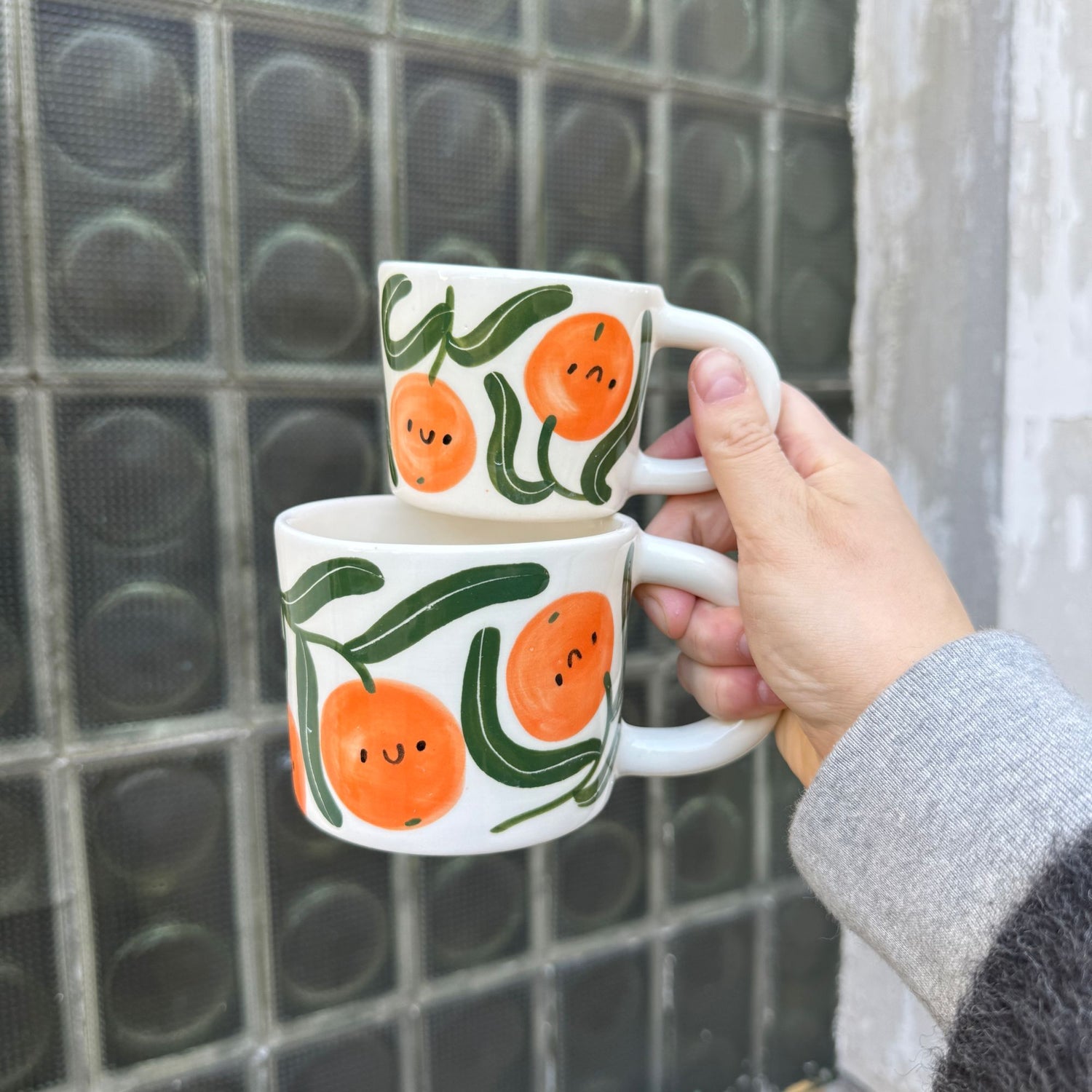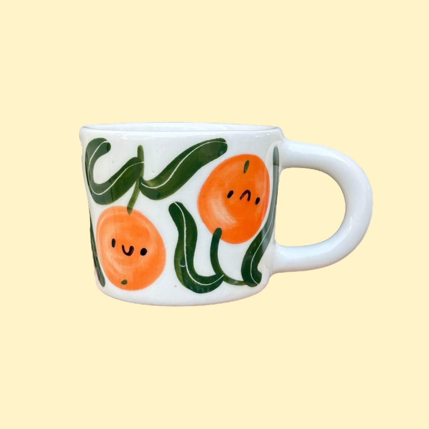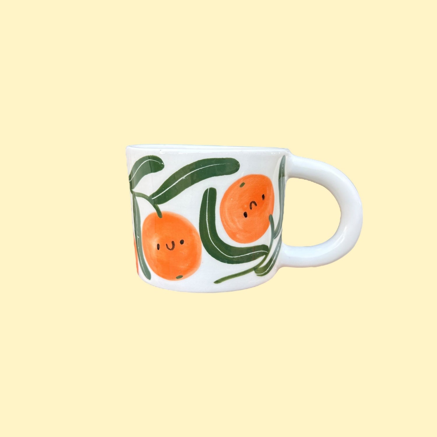 Ręcznie wykonany i malowany kubek z uśmiechniętymi pomarańczowymi cytrusami.