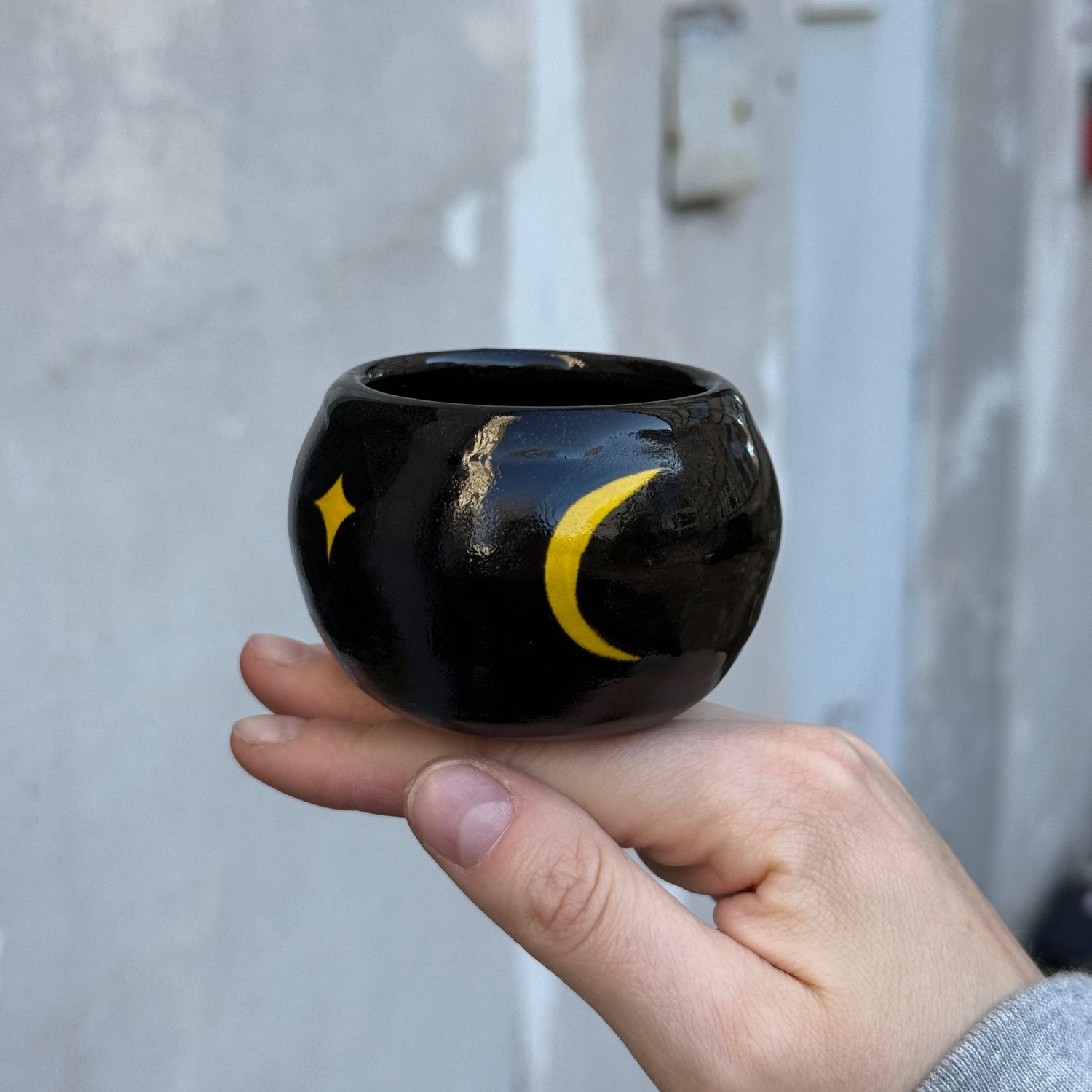 Ręcznie toczona na kole mała obła czarka pomalowana w drobny, gwiaździsty wzór.