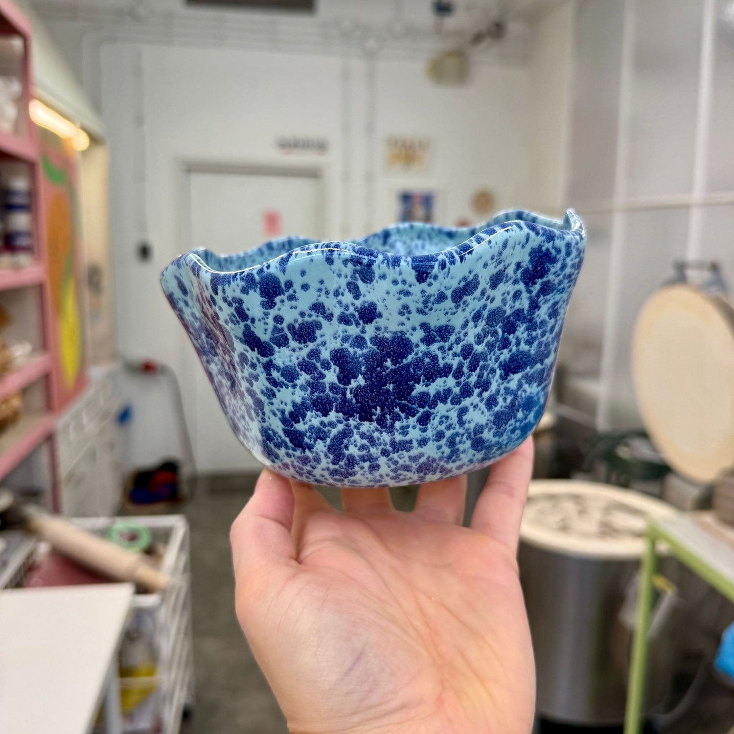 Masywna, ciężka miska średniej wielkości, pokryta jasnym miętowym szkliwem z kobaltowymi plamkami o różnym natężeniu.