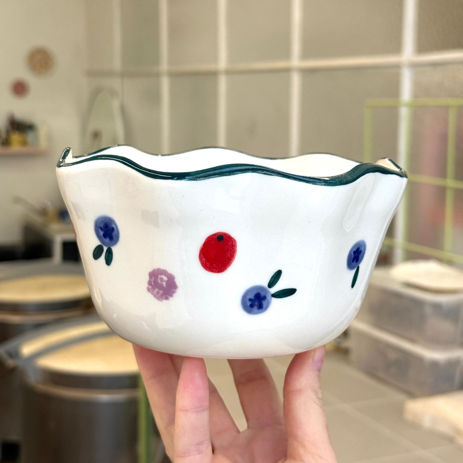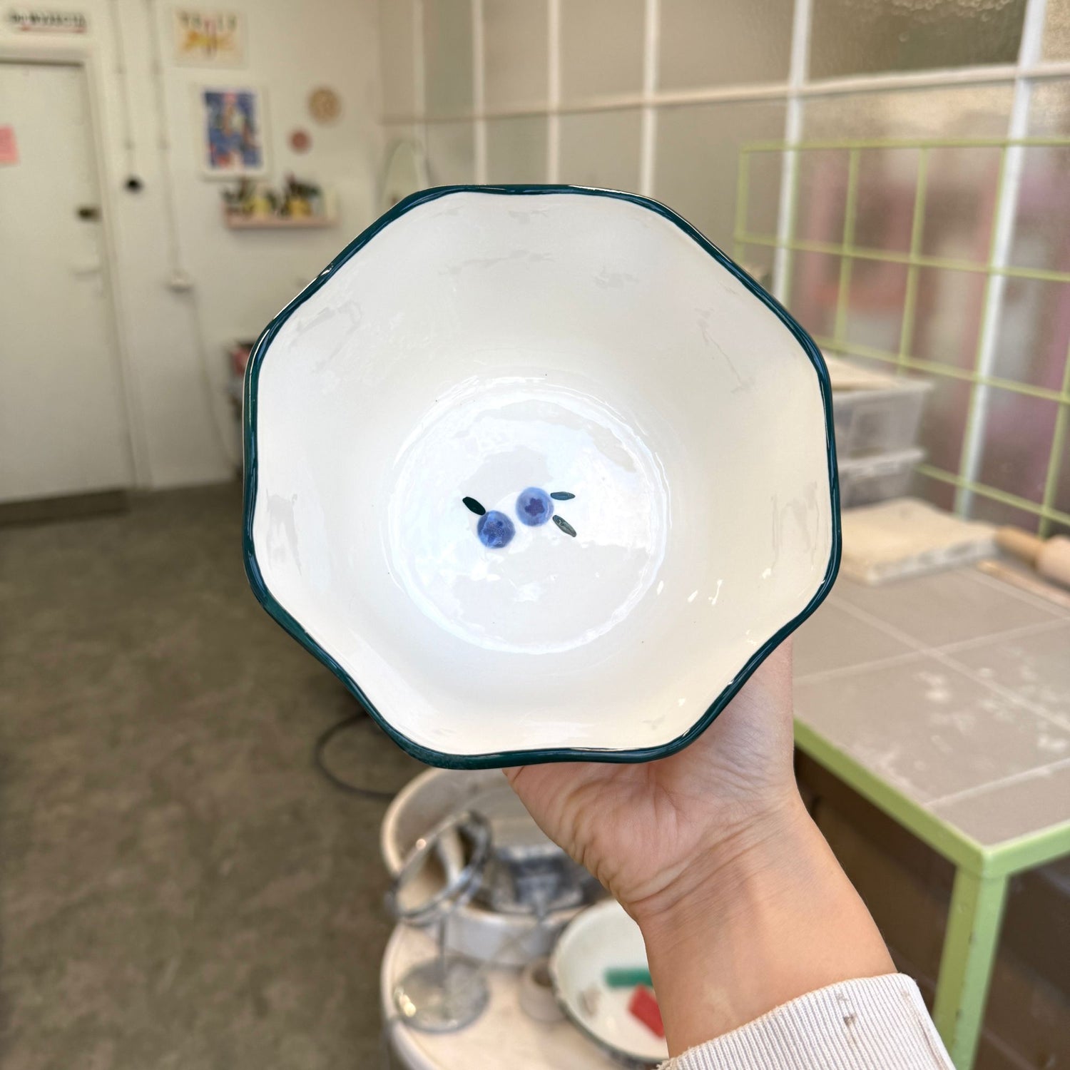 Masywna, ciężka miska średniej wielkości, ręcznie pomalowana w letni wzór z jagodami, malinami i jeżynami.