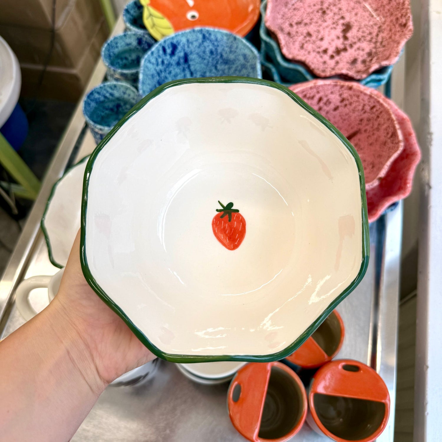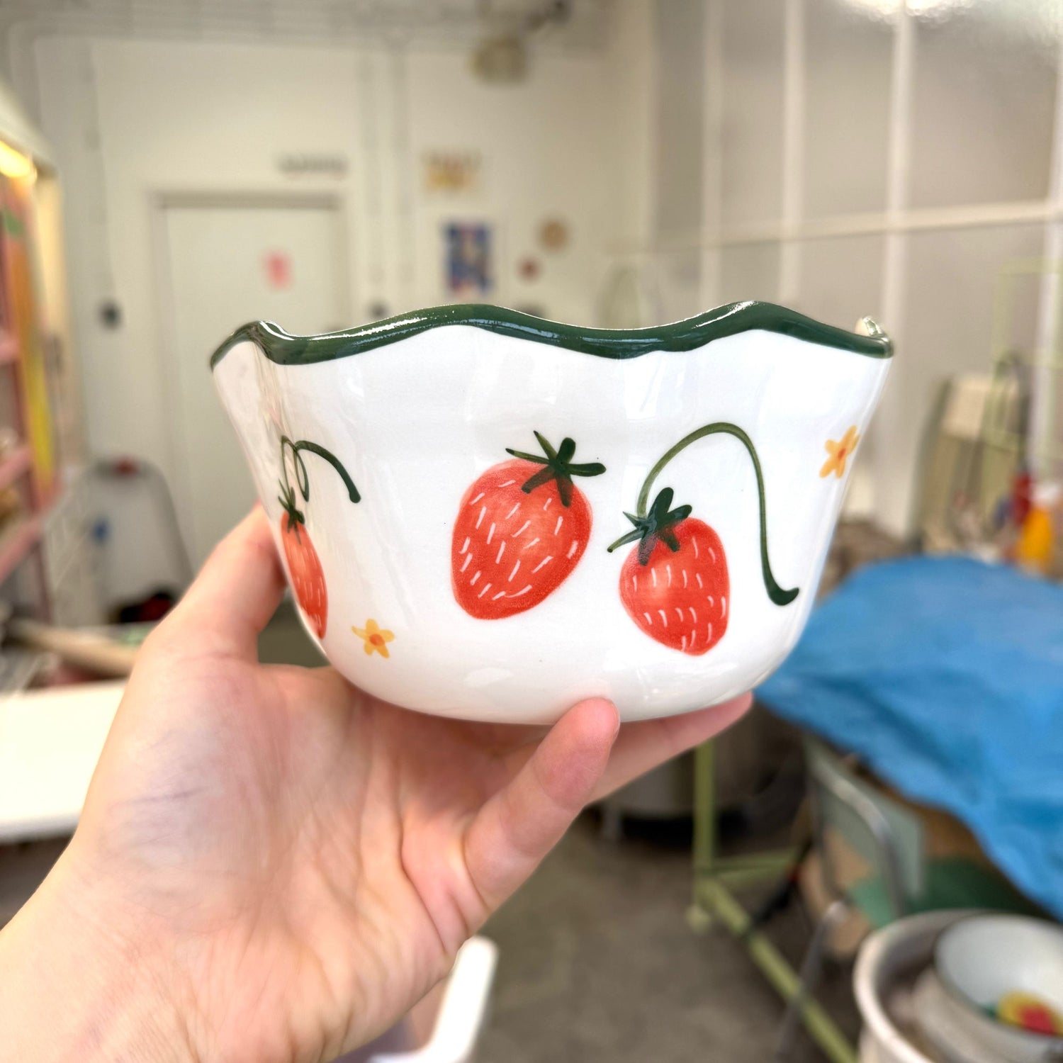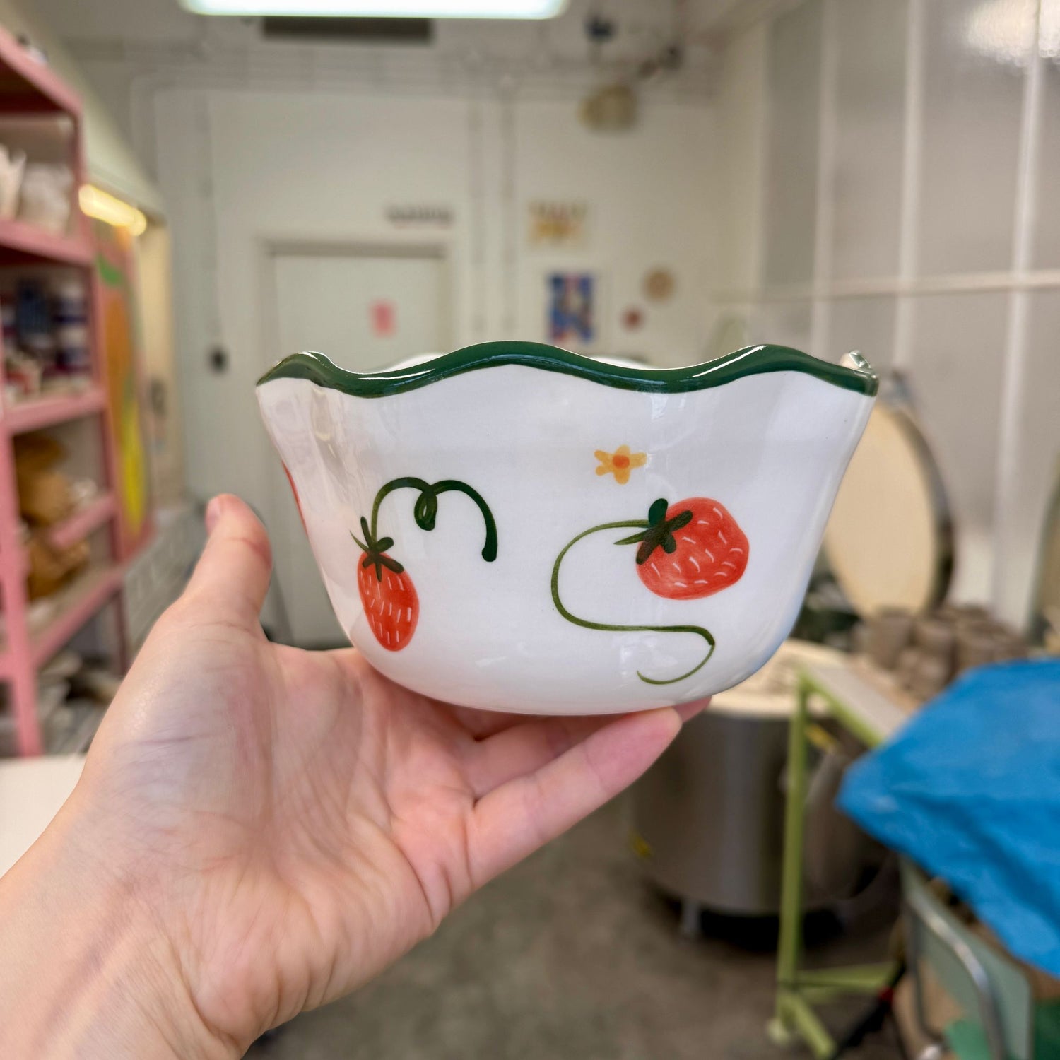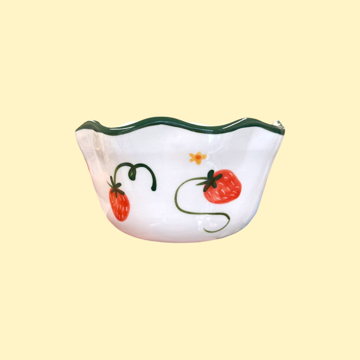 Masywna, ciężka miska średniej wielkości, z ręcznie namalowanymi drobnymi truskawkami. Nadaje się do mycia w zmywarce.