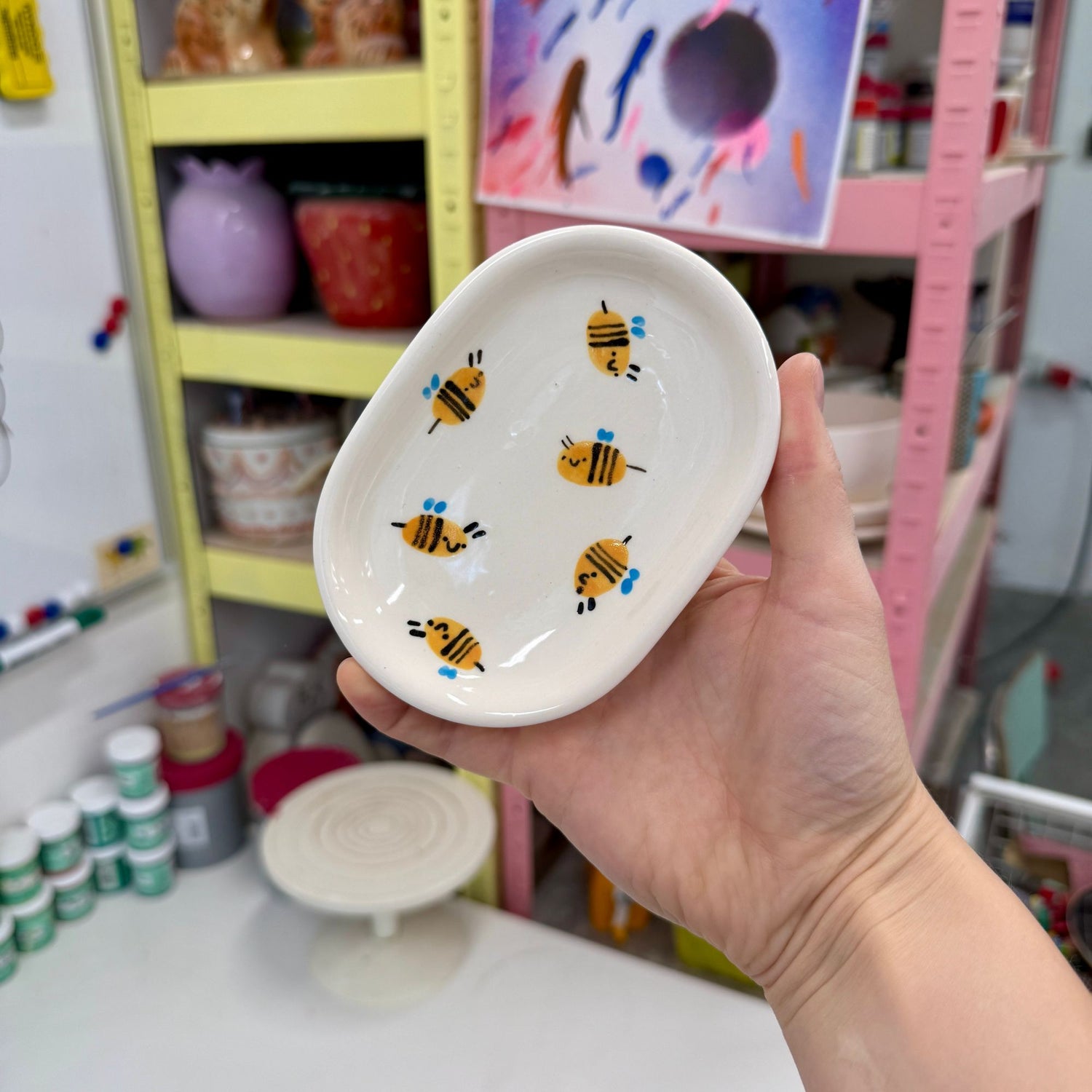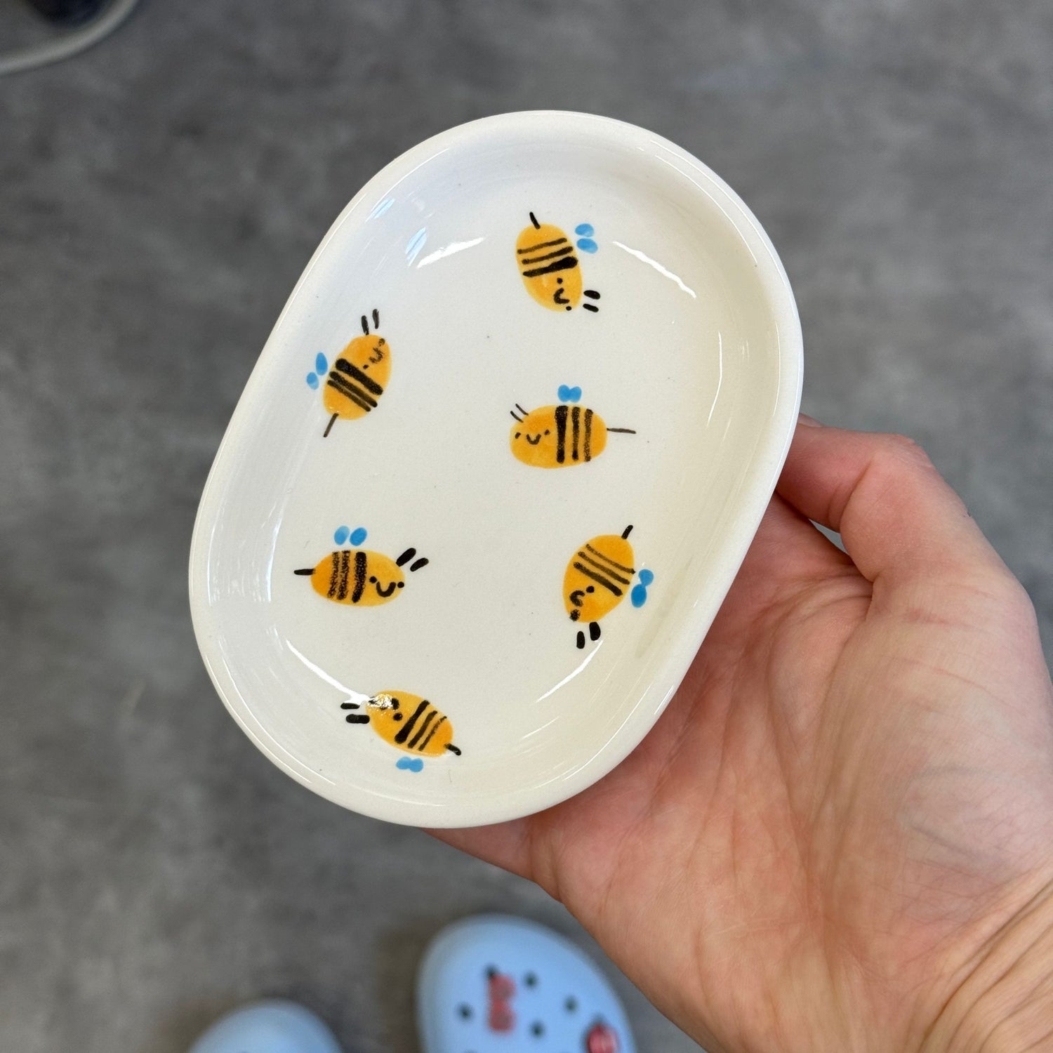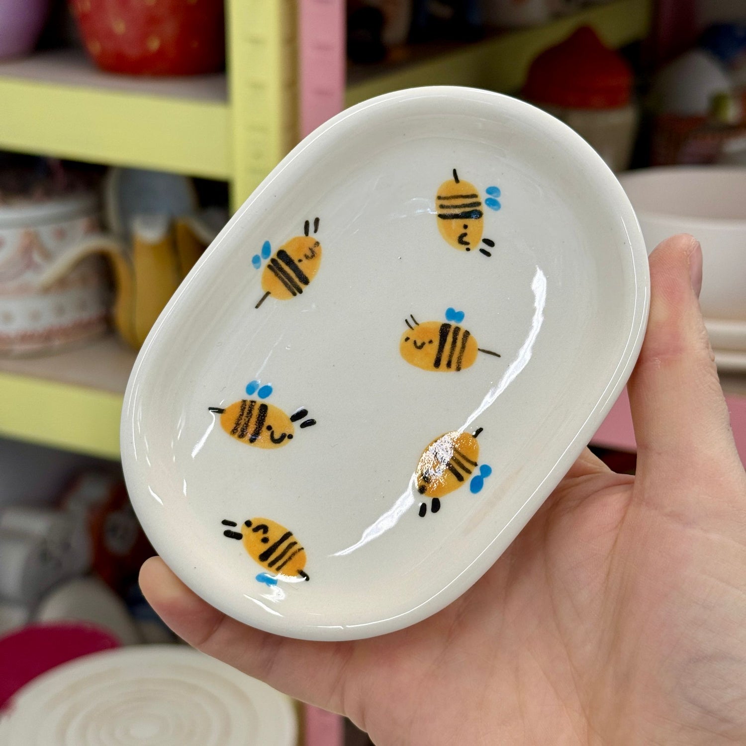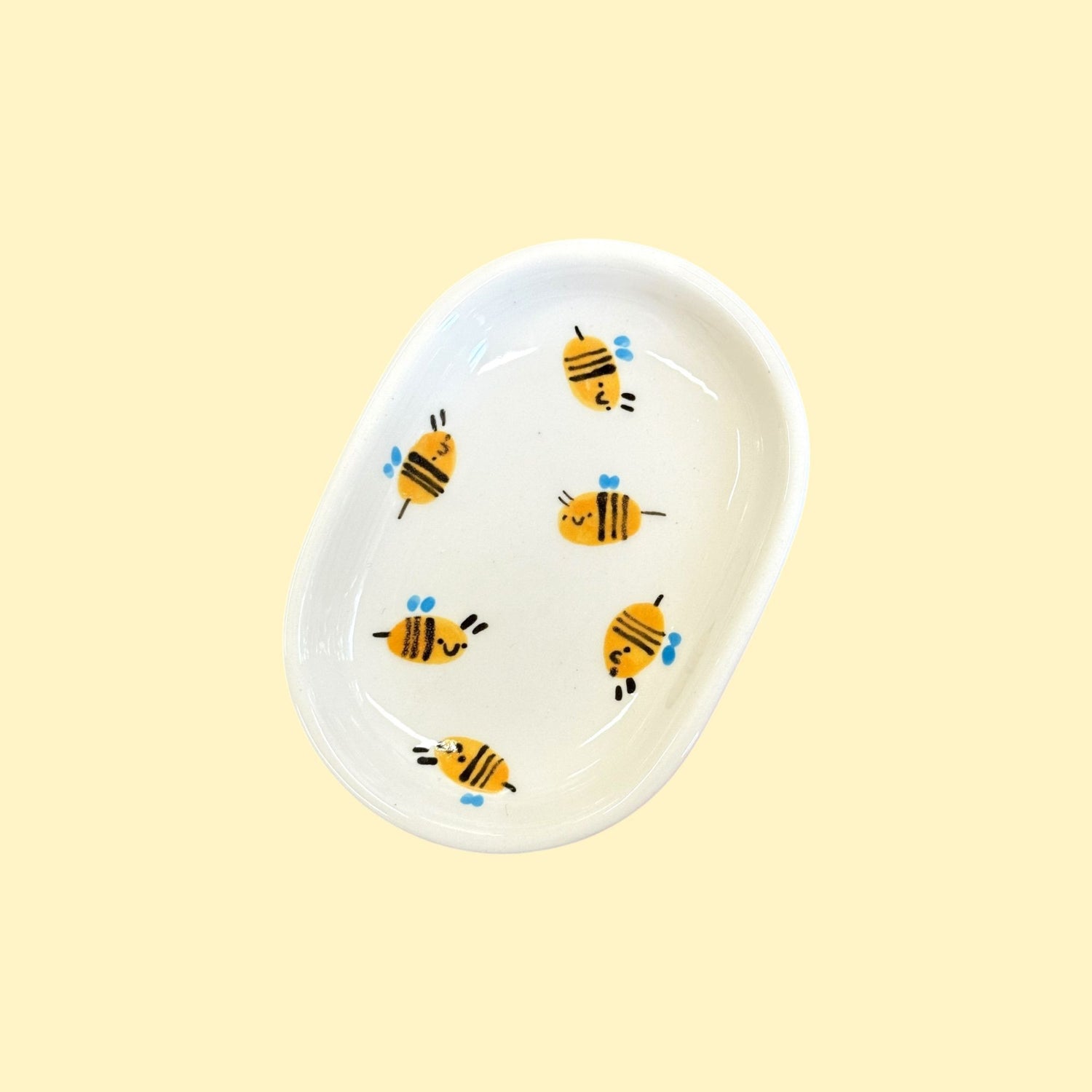 Nieduża, ręcznie odlewana mydelniczka z namalowanymi pszczółkami. Każda mydelniczka jest pokryta błyszczącym szkliwem.