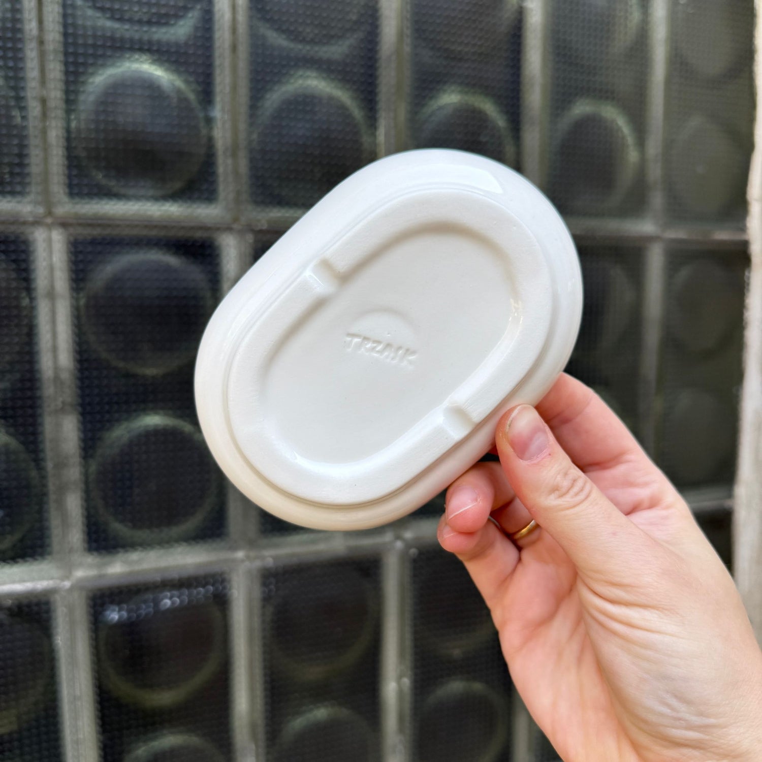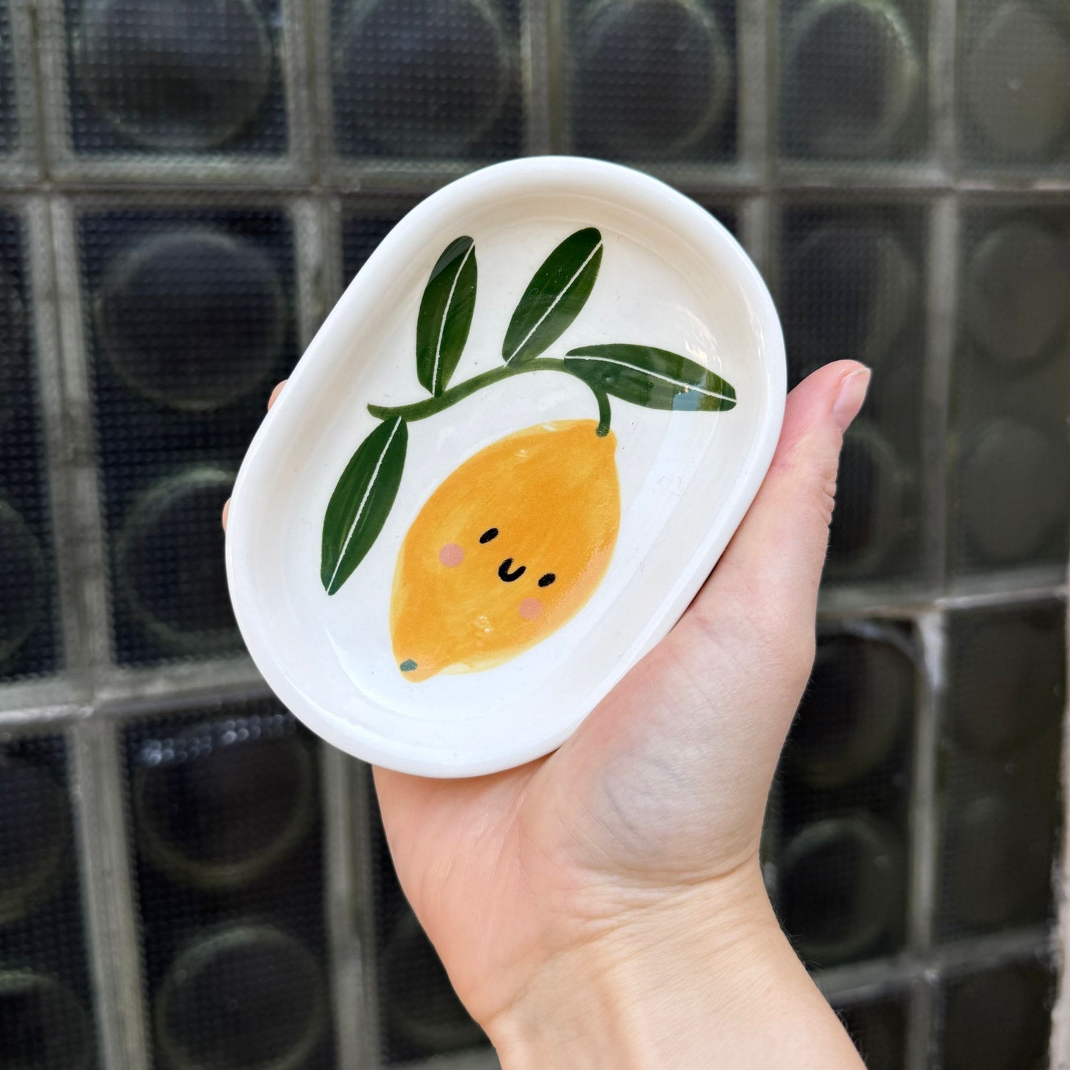 Nieduża, ręcznie odlewana mydelniczka z cytrusowo-roślinnym wzorem. Każda mydelniczka jest pokryta błyszczącym szkliwem.