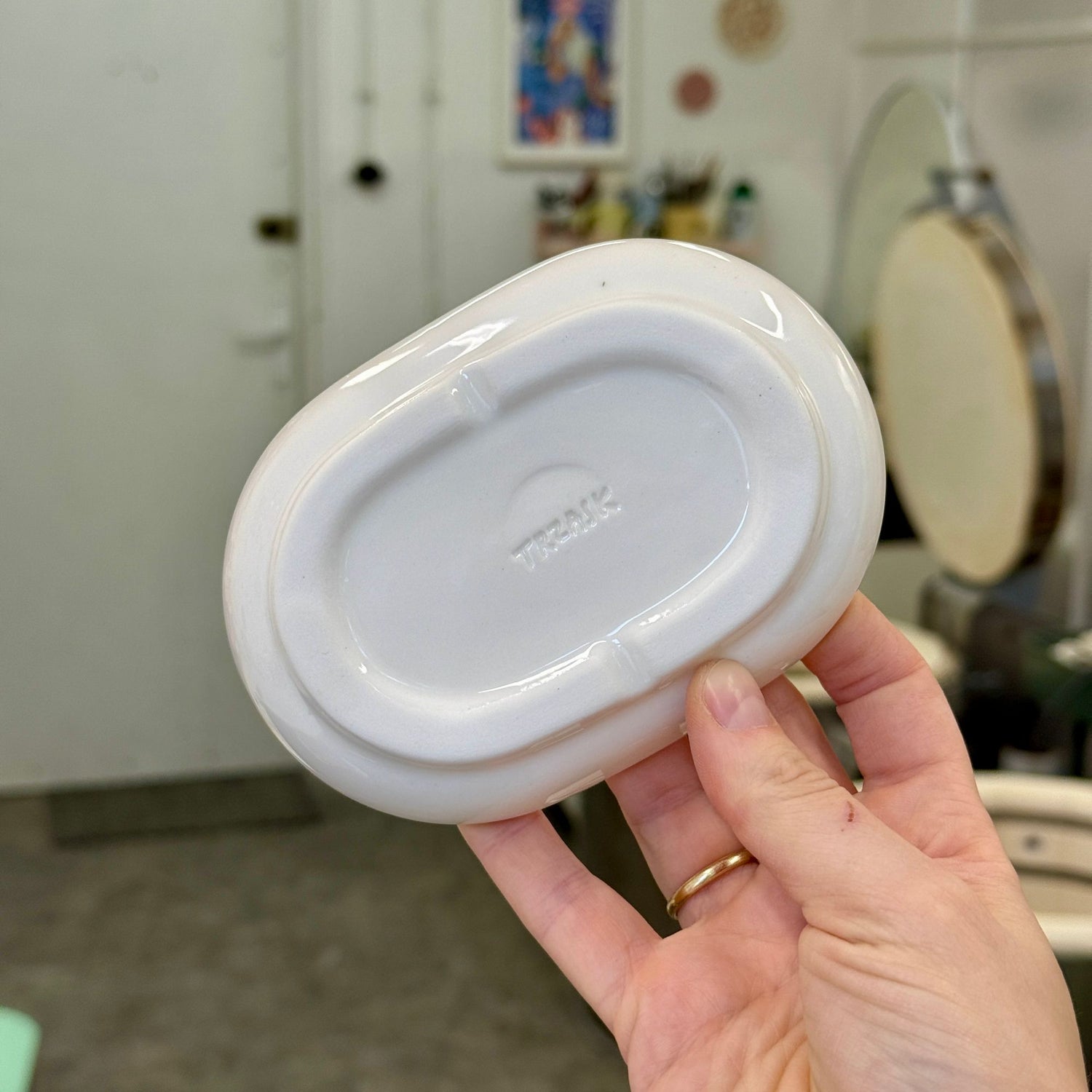 Nieduża, ręcznie odlewana mydelniczka z cytrusowo-roślinnym wzorem. Każda mydelniczka jest pokryta błyszczącym szkliwem.