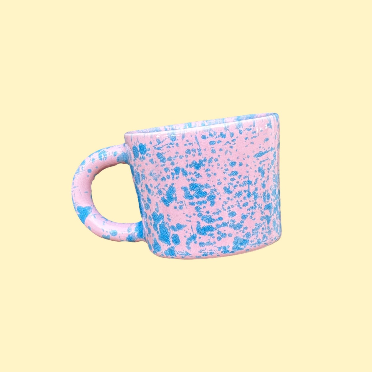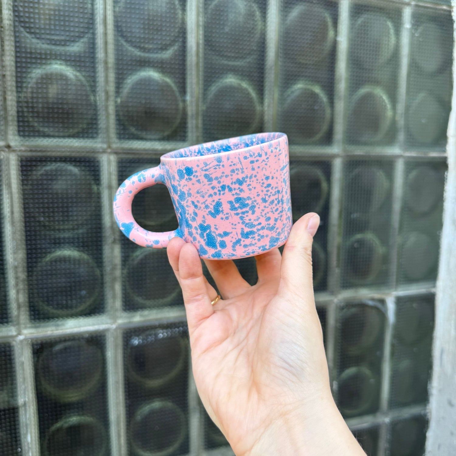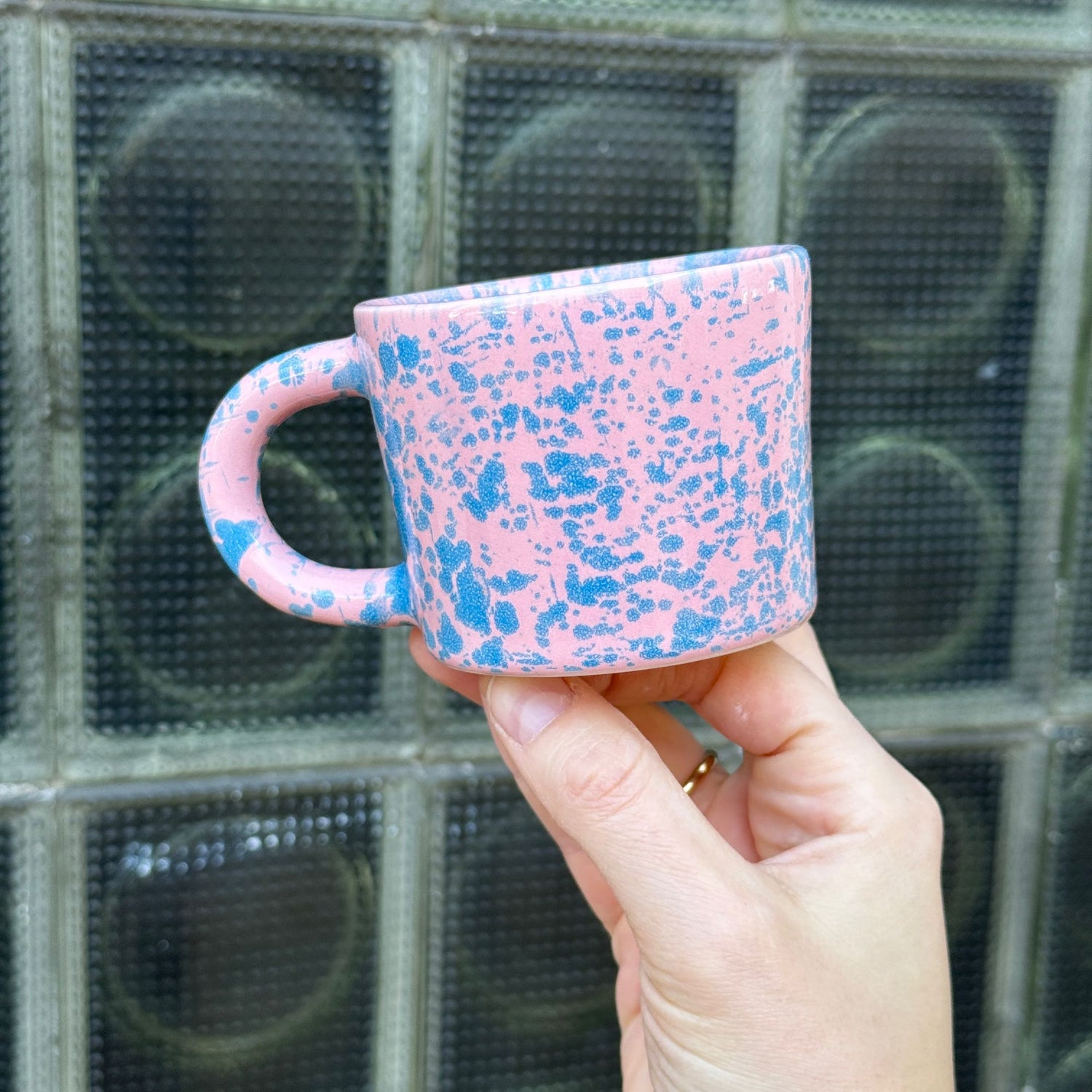 Ręcznie odlewany i malowany kubek z kolorowym wzorem. Poszkliwiony błyszczącym różowym szkliwem i nieregularnymi błękitnymi plamkami.