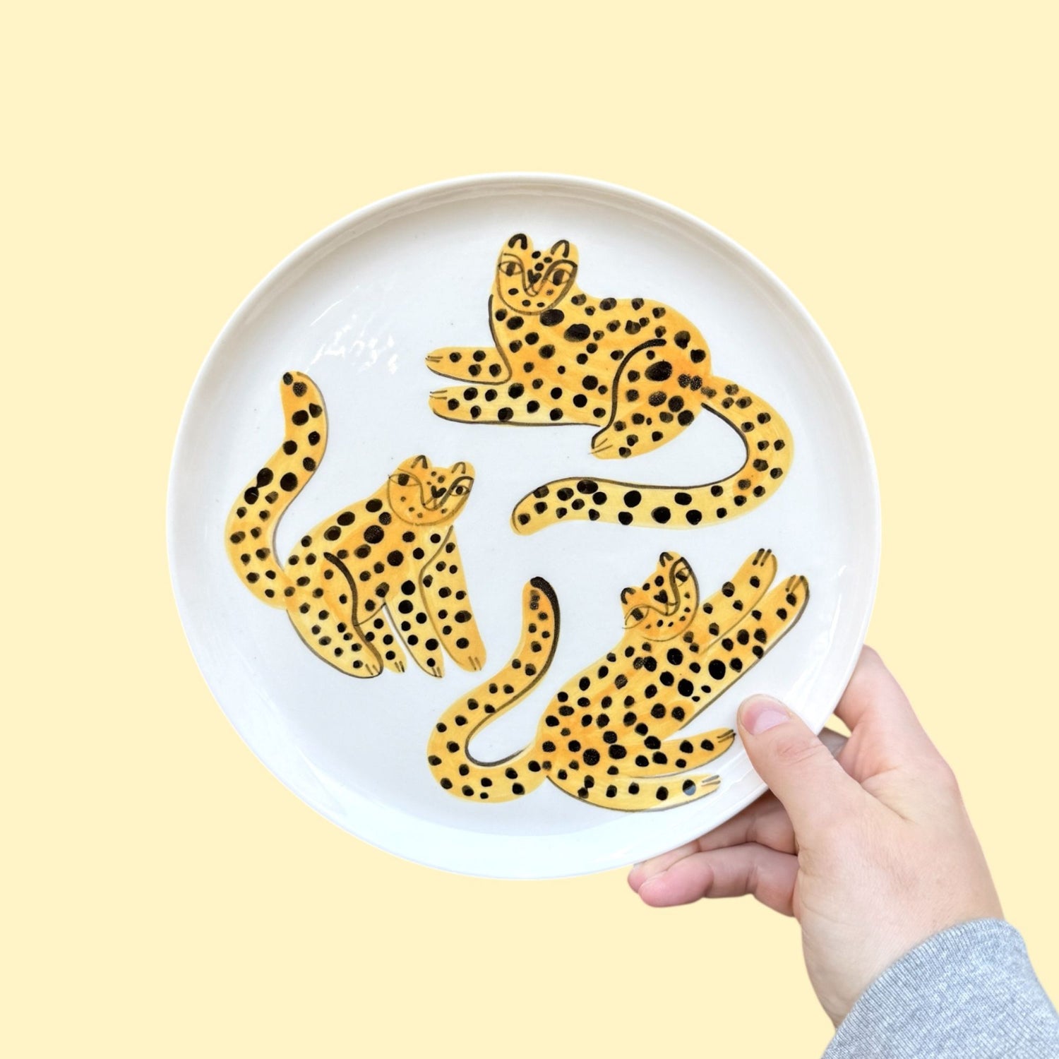 Okrągły, ręcznie odlewany talerz ze stadem lampartów. Pokryty błyszczącym szkliwem, jest również bezpieczny do kontaktu z żywnością, ale można go też powiesić na ścianie. Nadaje się do mycia w zmywarce.