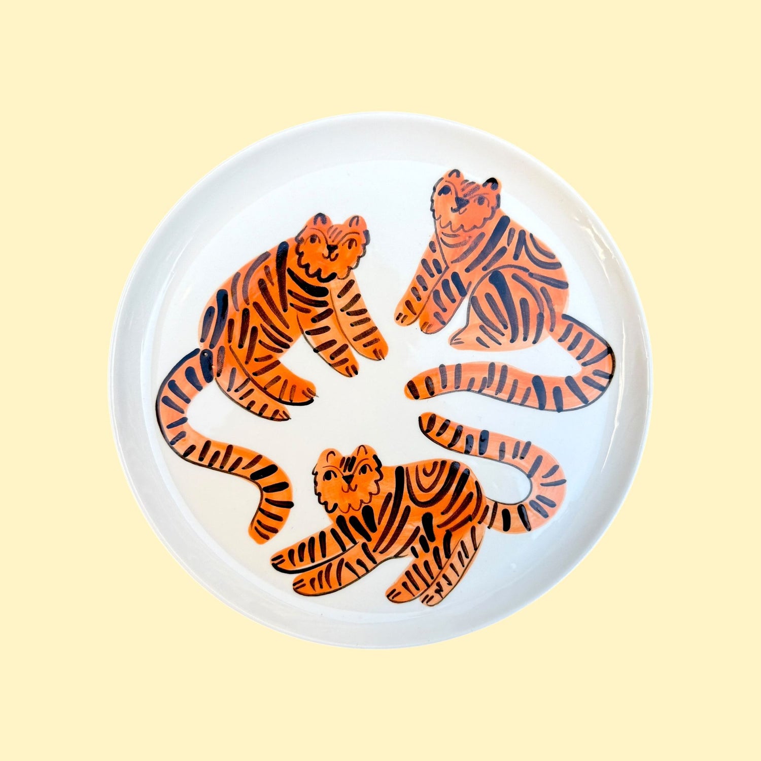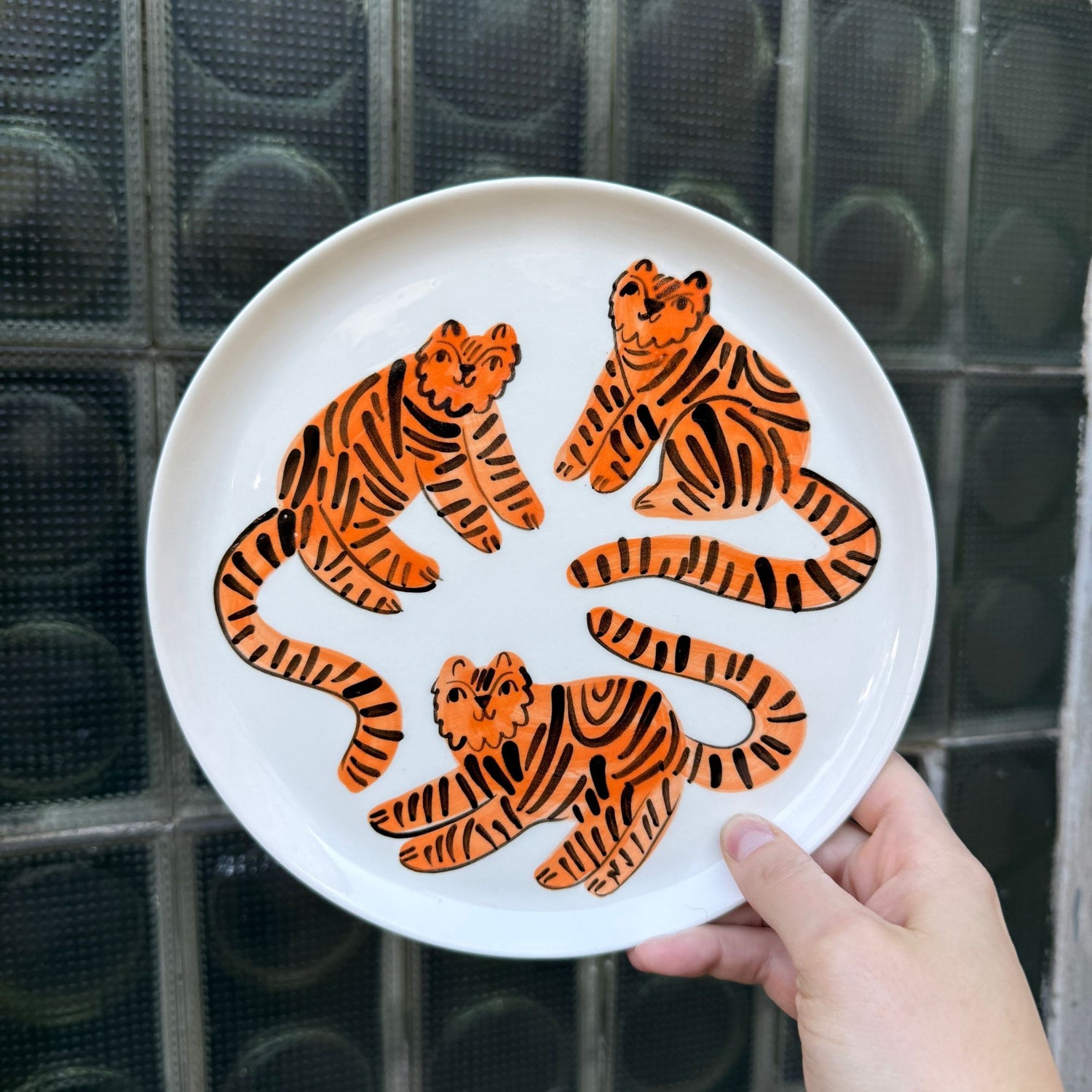 Okrągły, ręcznie odlewany talerz z namalowanym stadem tygrysów. Pokryty błyszczącym szkliwem, jest również bezpieczny do kontaktu z żywnością, ale można go też powiesić na ścianie. Nadaje się do mycia w zmywarce.