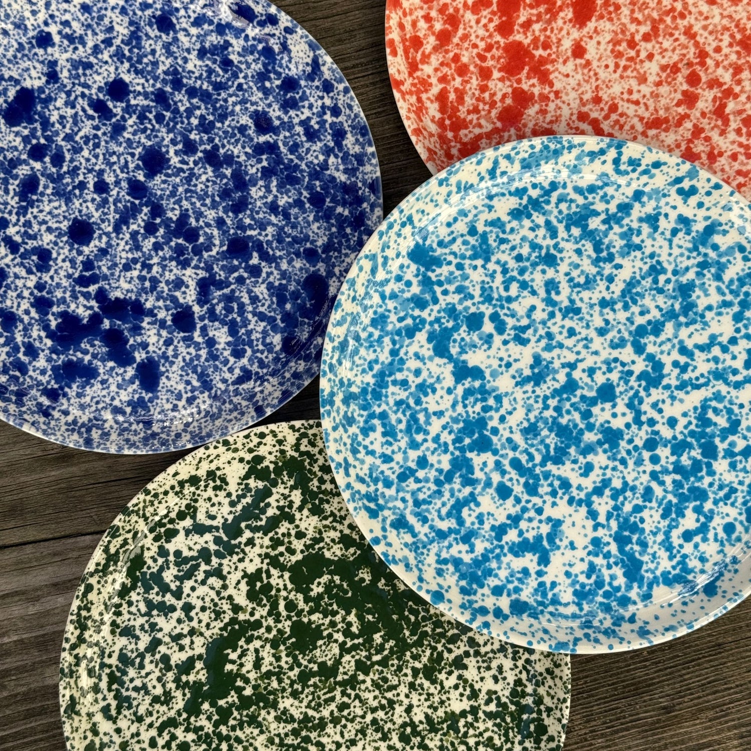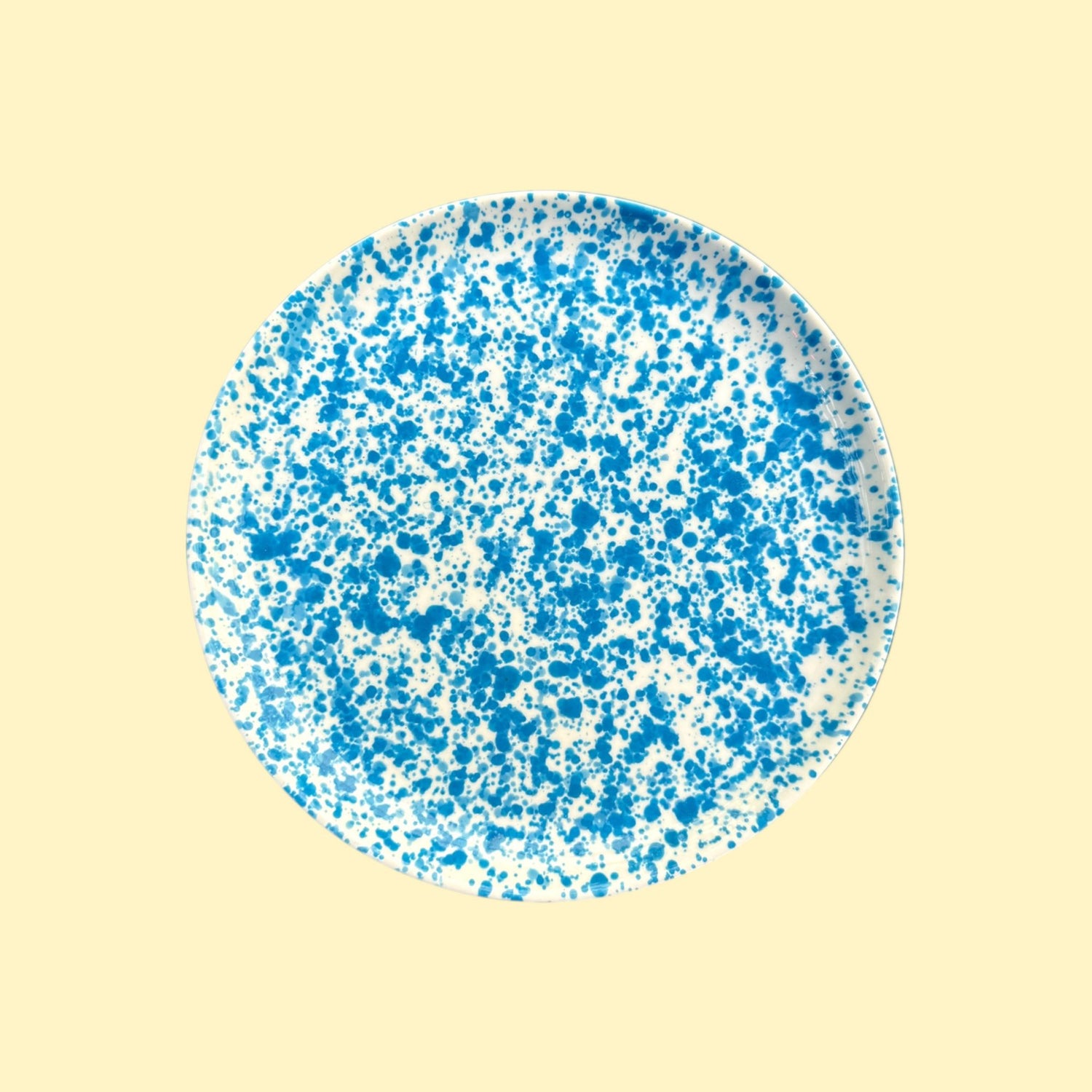 Okrągły, ręcznie odlewany talerzyk deserowy z namalowanymi jasnoniebieskimi plamkami. Każdy talerzyk ma trochę inny wzór. Pokryty transparentnym szkliwem, jest bezpieczny do kontaktu z żywnością, ale można go też powiesić na ścianie. Nadaje się do mycia w zmywarce.
