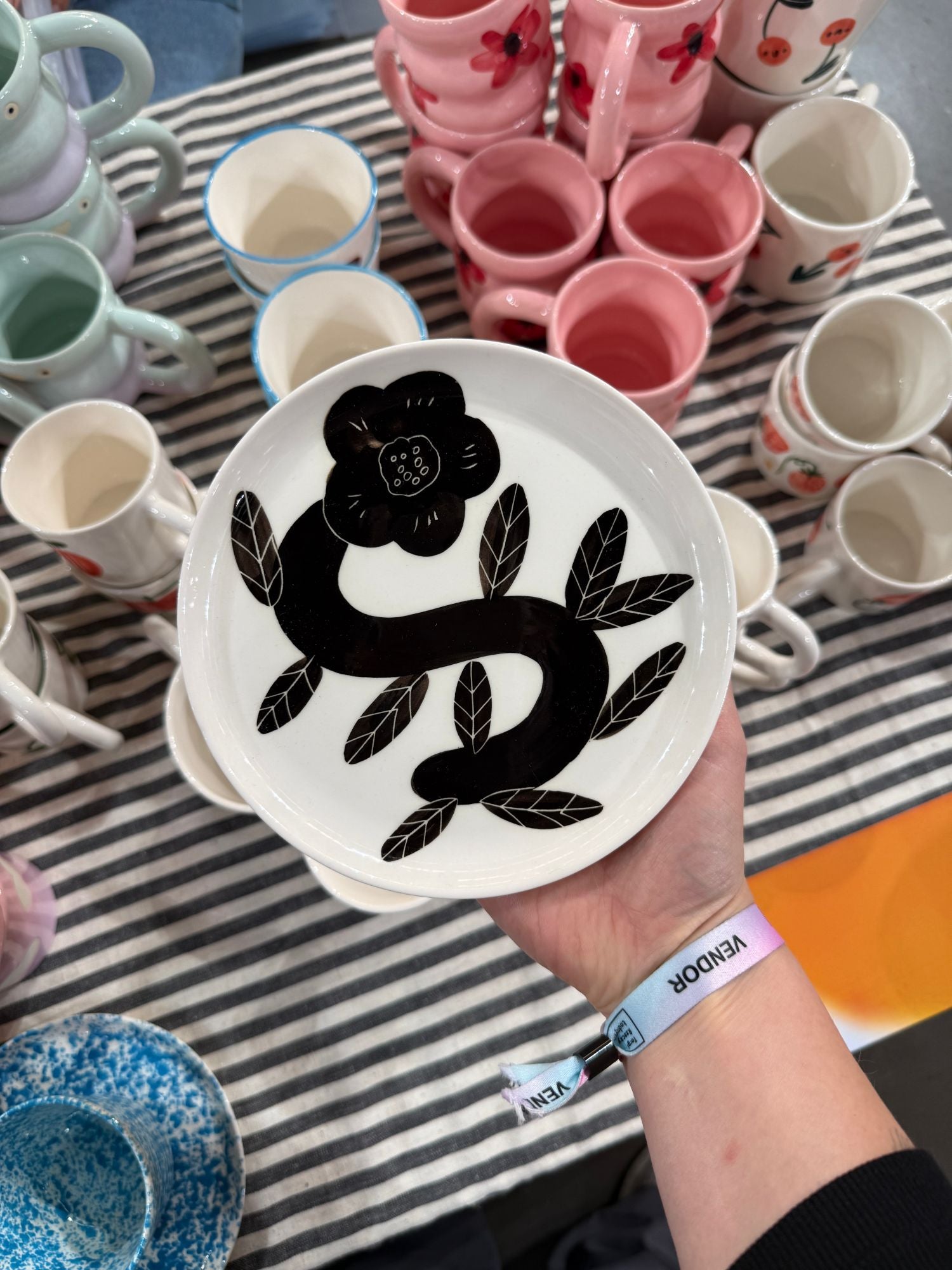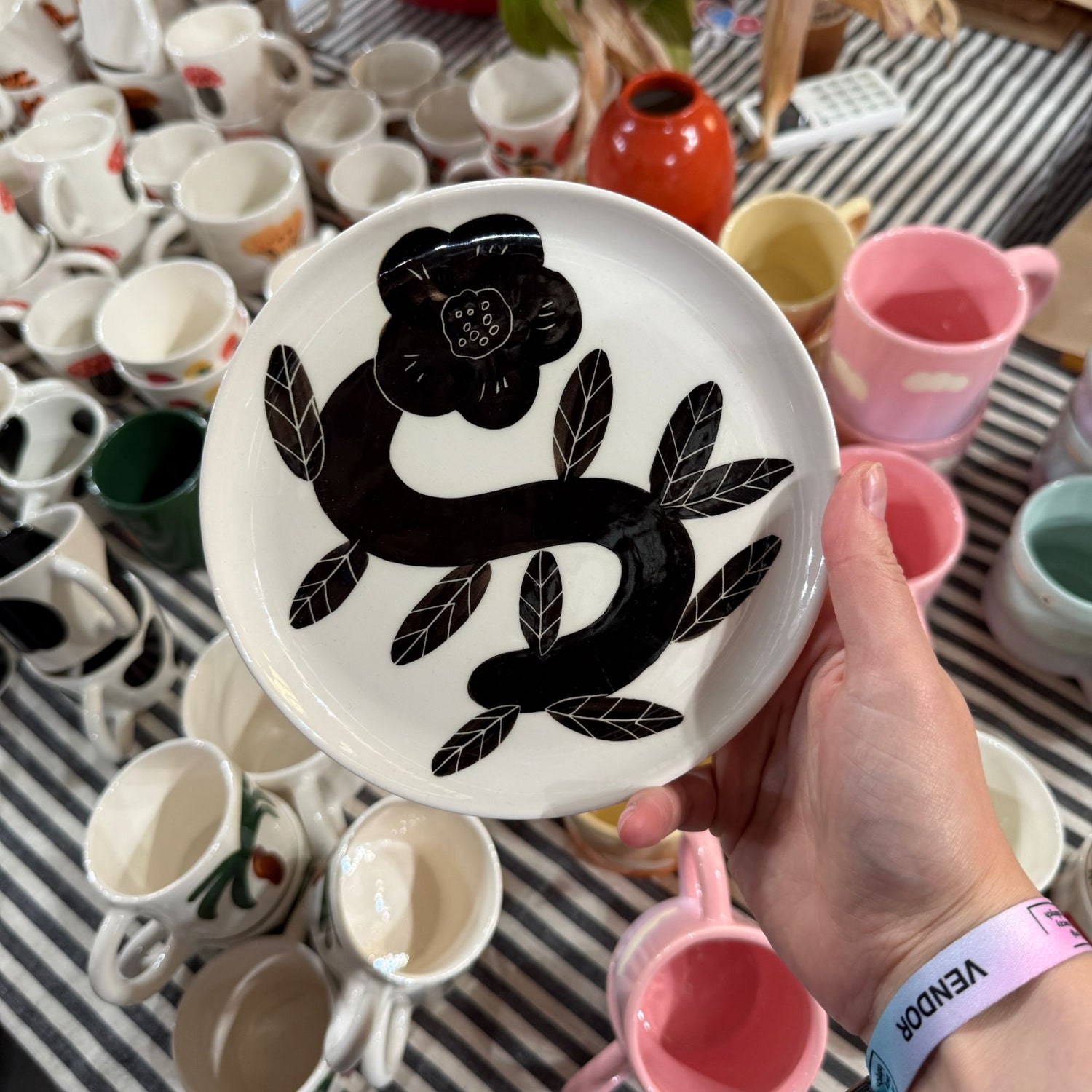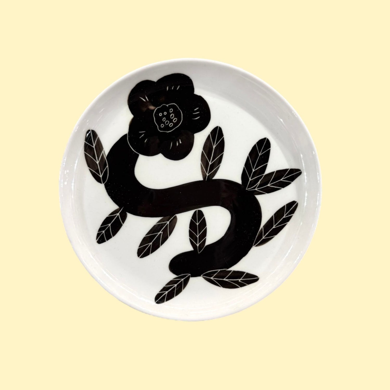 Okrągły, ręcznie odlewany talerzyk deserowy z namalowanymi czarnymi kwiatami. Pokryty błyszczącym szkliwem, jest bezpieczny do kontaktu z żywnością, ale można go też powiesić na ścianie. Nadaje się do mycia w zmywarce.